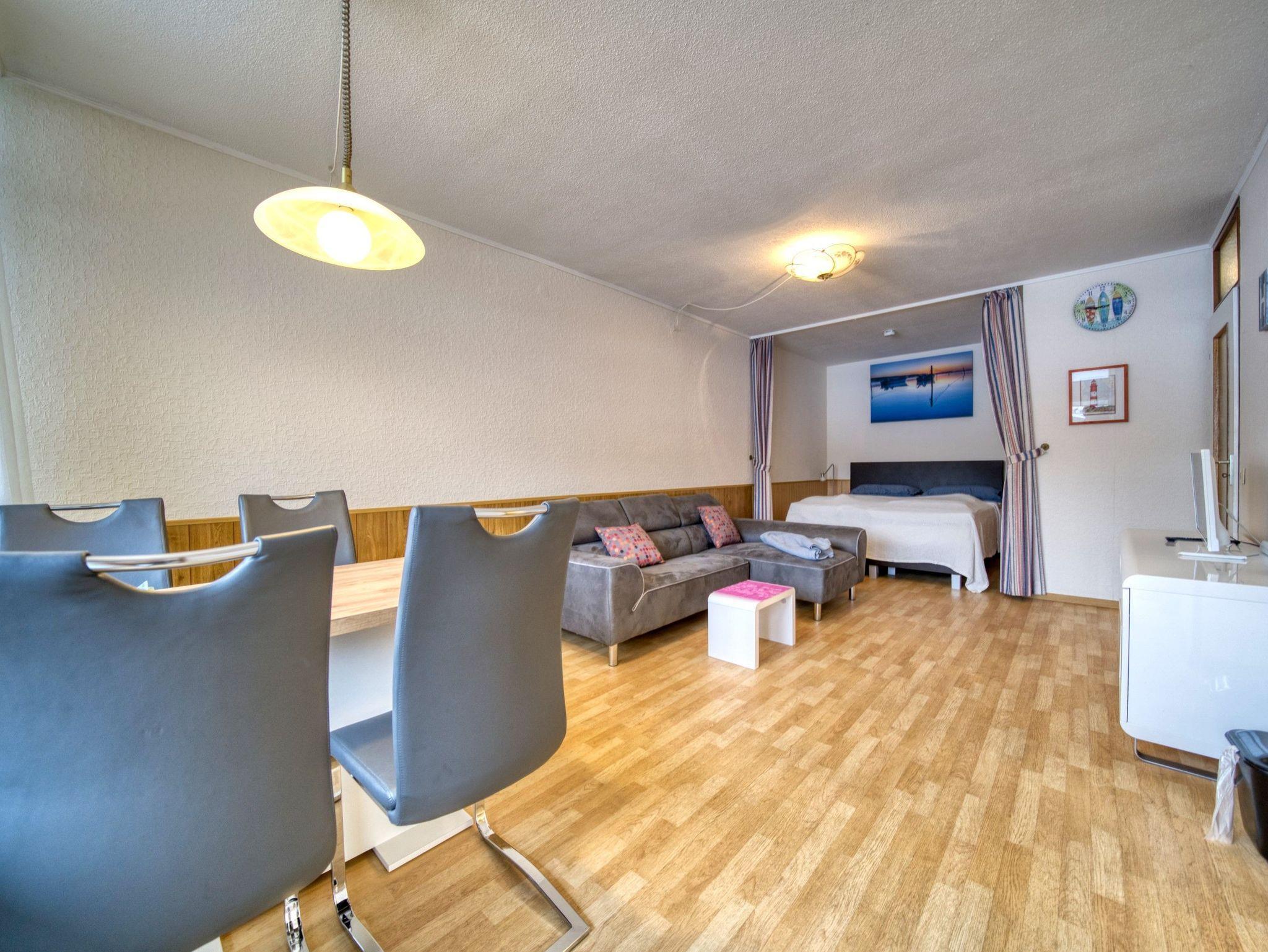 Wohn-Schlafbereich mit Doppelbett, Sofa und Esstisch am Fenster
