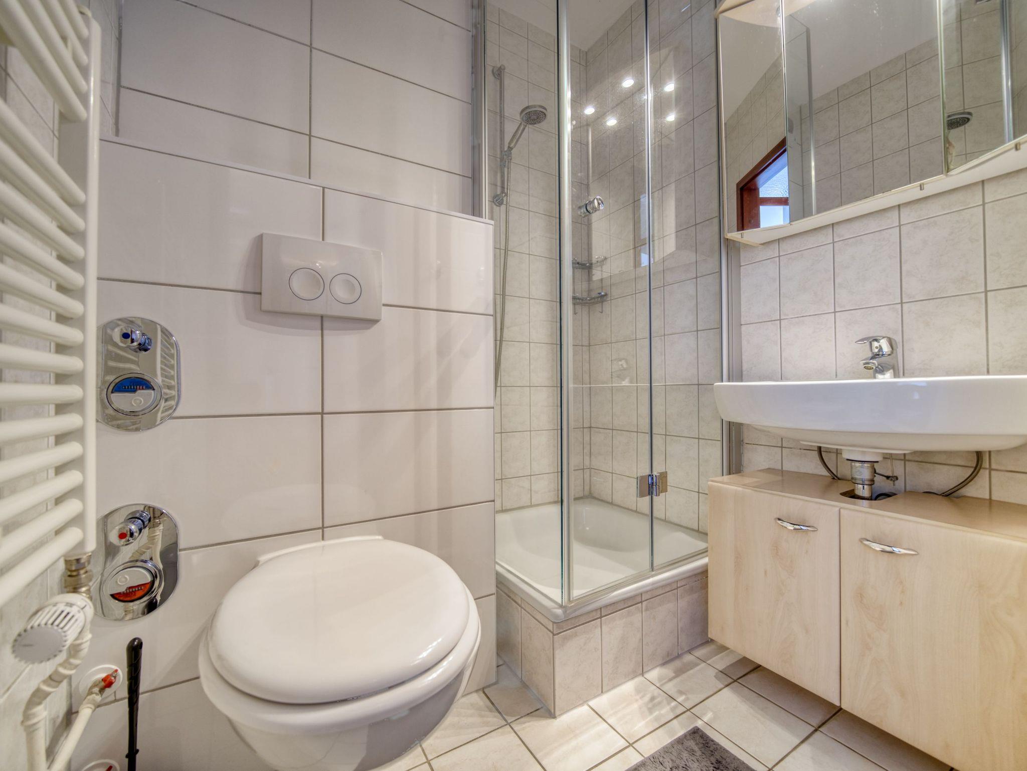 Badezimmer mit WC und Duschkabine und Handtuchtrockner