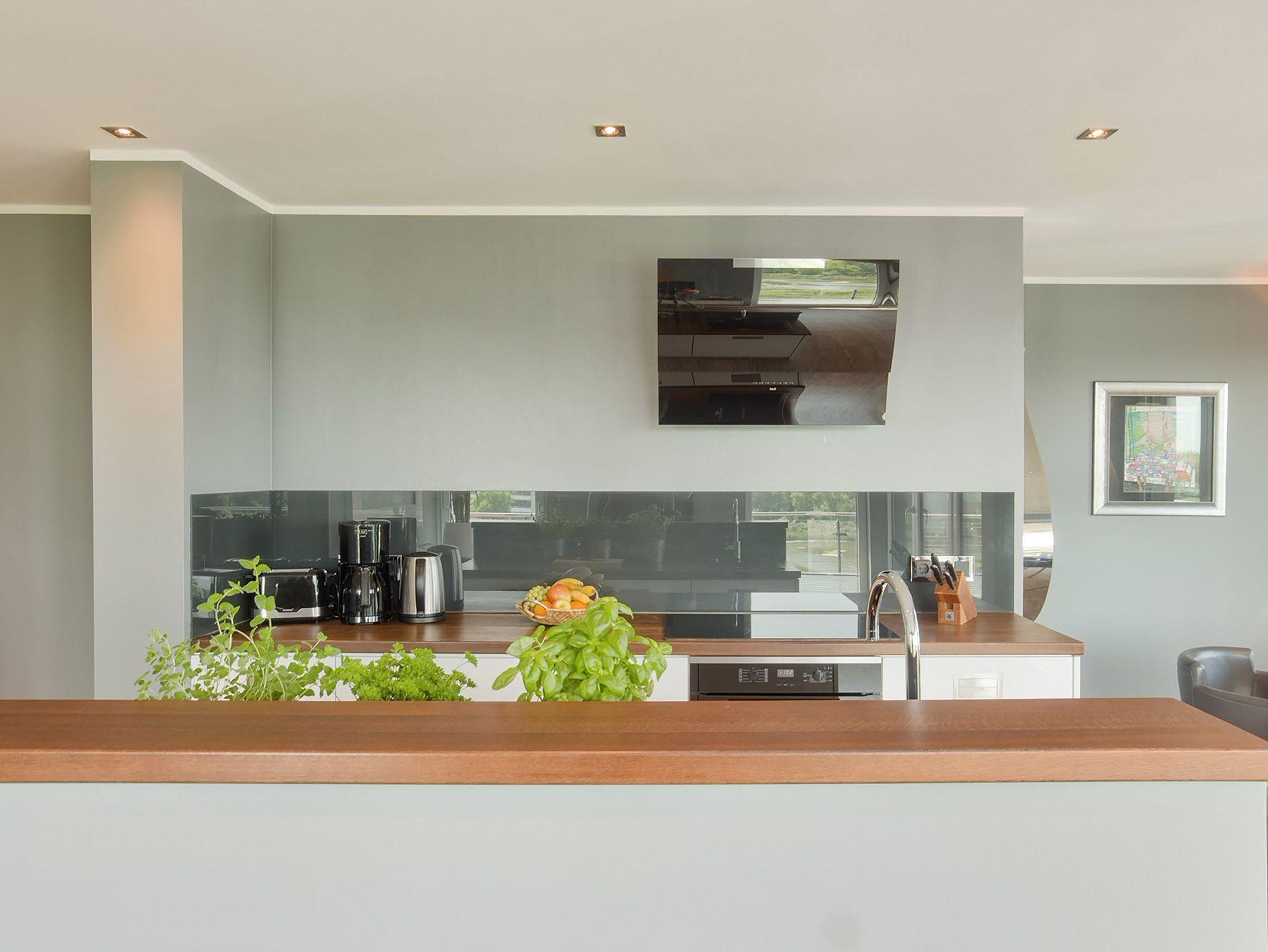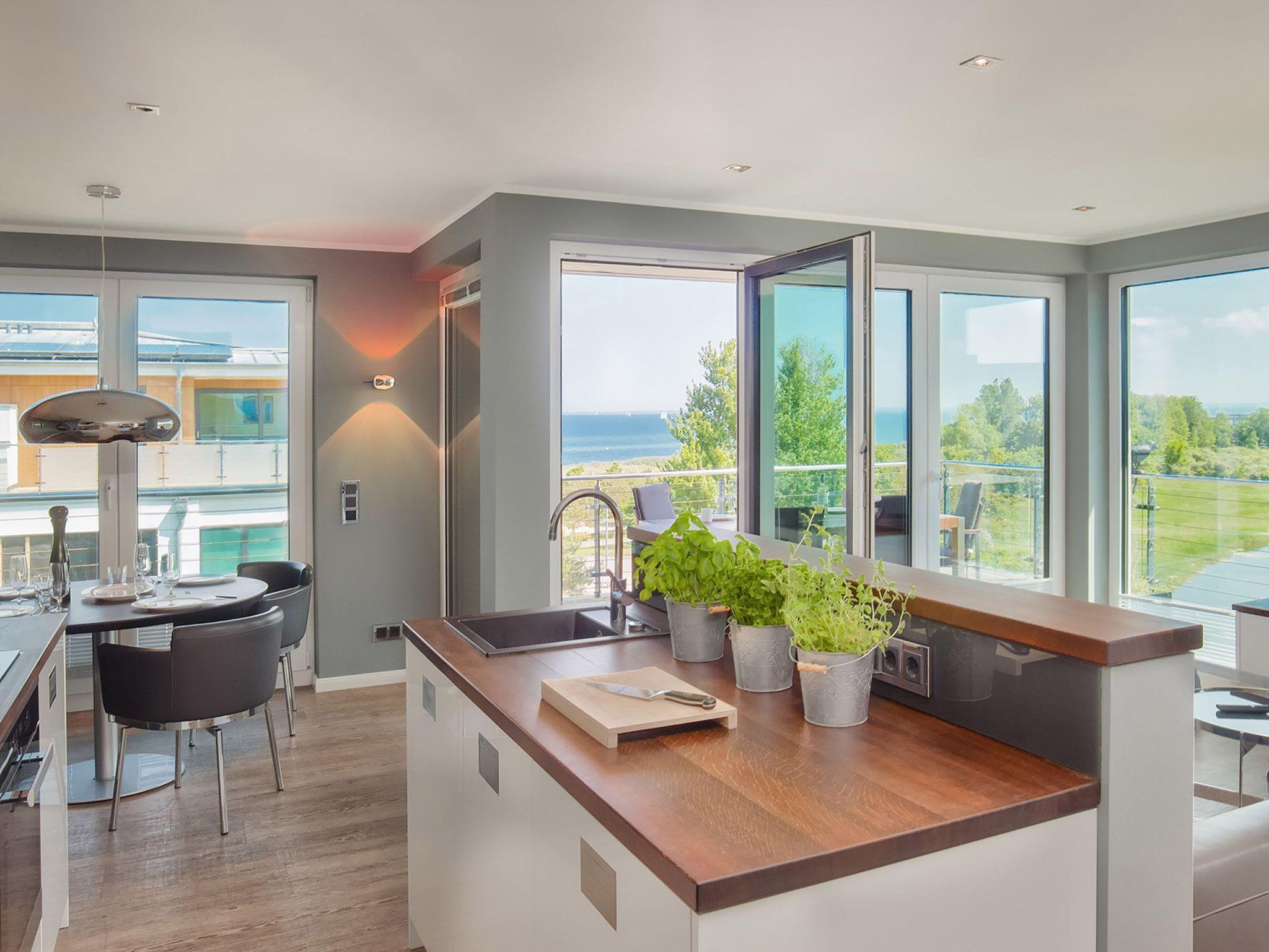Der lichtdurchflutete Wohnbereich lädt mit zwei bequemen Couches, einem 3D-TV (inklusive Brillen), einer SONOS-Soundanlage und einem Blu-Ray-Player zum Entspannen ein. Die angrenzende, offene Designerküche ist voll ausgestattet und verfügt über ein Induktionskochfeld, hochwertige WMF-Küchenutensilien und zahlreiche Extras, um höchsten kulinarischen Ansprüchen gerecht zu werden. Der Essbereich bietet einen direkten Ostseeblick und schafft eine besondere Atmosphäre beim Speisen.