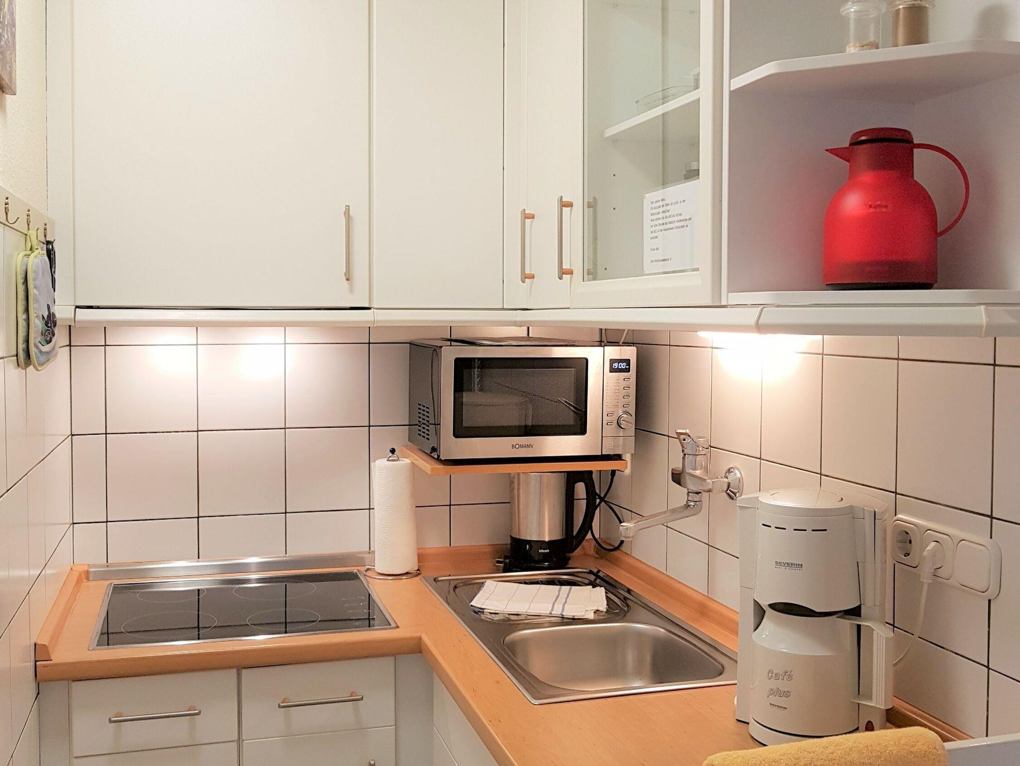 Die Einbauküche ist komplett eingerichtet: Ceranfeld mit 4 Kochfeldern, Kühlschrank mit Eisfach, Kaffeemaschine, Toaster, Wasserkocher, Mikrowelle mit Grillfunktion, Geschirr usw.