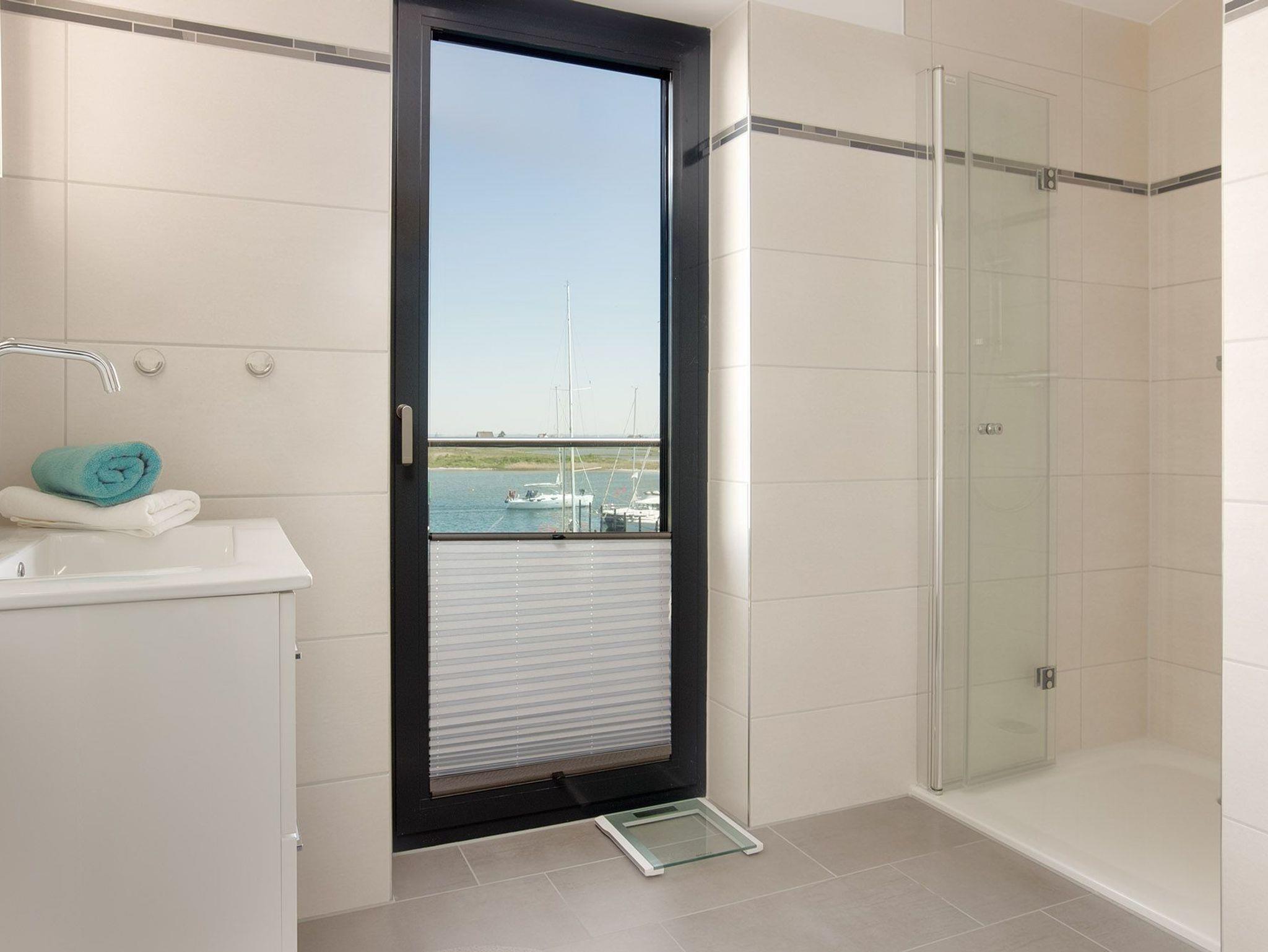 Das Badezimmer mit ebenerdiger Dusche, Wanne, Handtuchwärmer und Jachthafenblick bietet entsprechende Annehmlichkeiten. Entspannen geht hier wie von allein! Zum Komfort gehört zudem ein separates Gäste-WC und eine Waschmaschine. Auch Flur und die Garderobe beeindrucken.