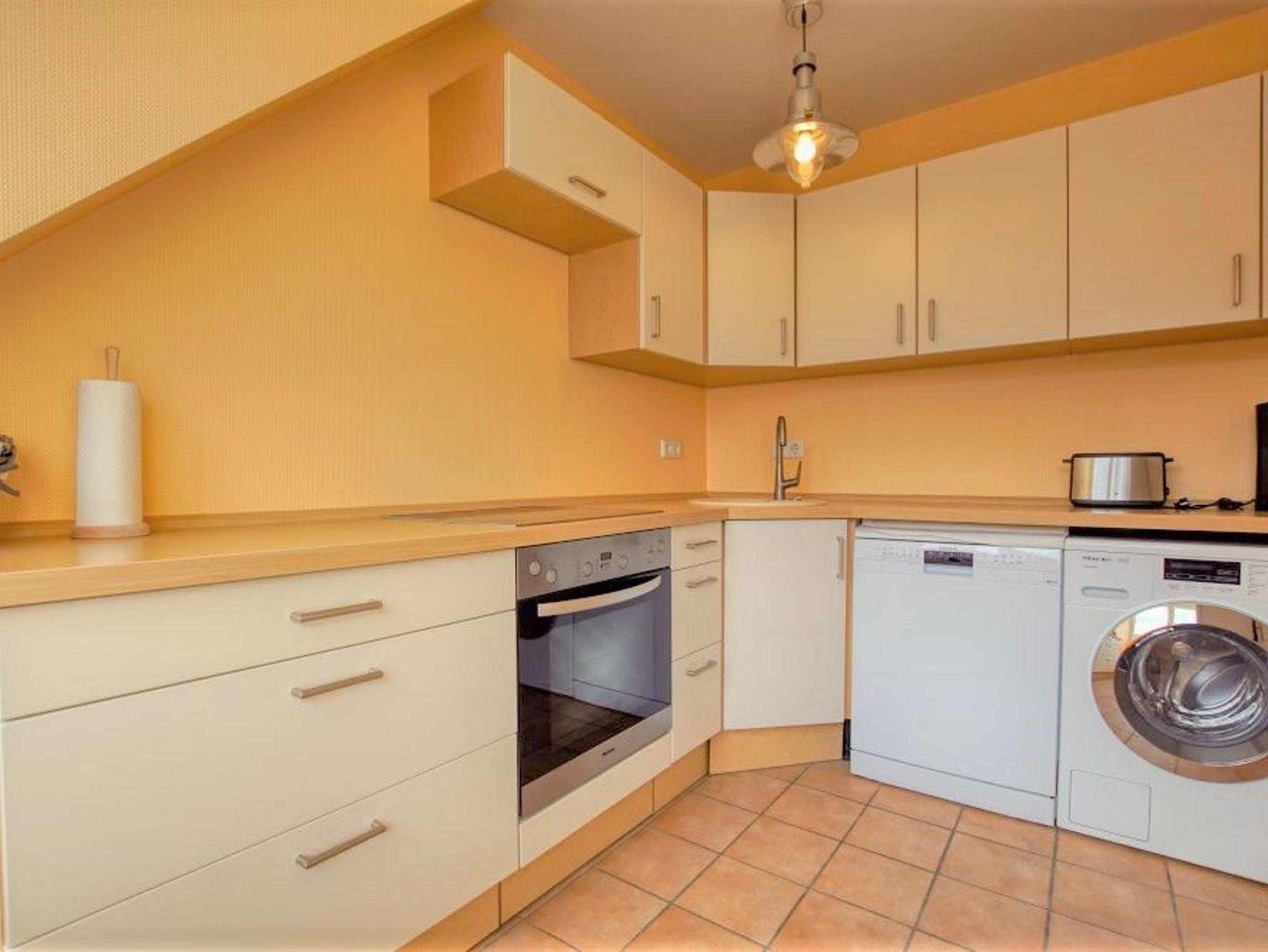 Voll ausgestattete Küche mit Kühl- und Gefrierkombi, Geschirrspüler, Backofen, Herd, Kaffeemaschine, Mikrowelle und Wasserkocher