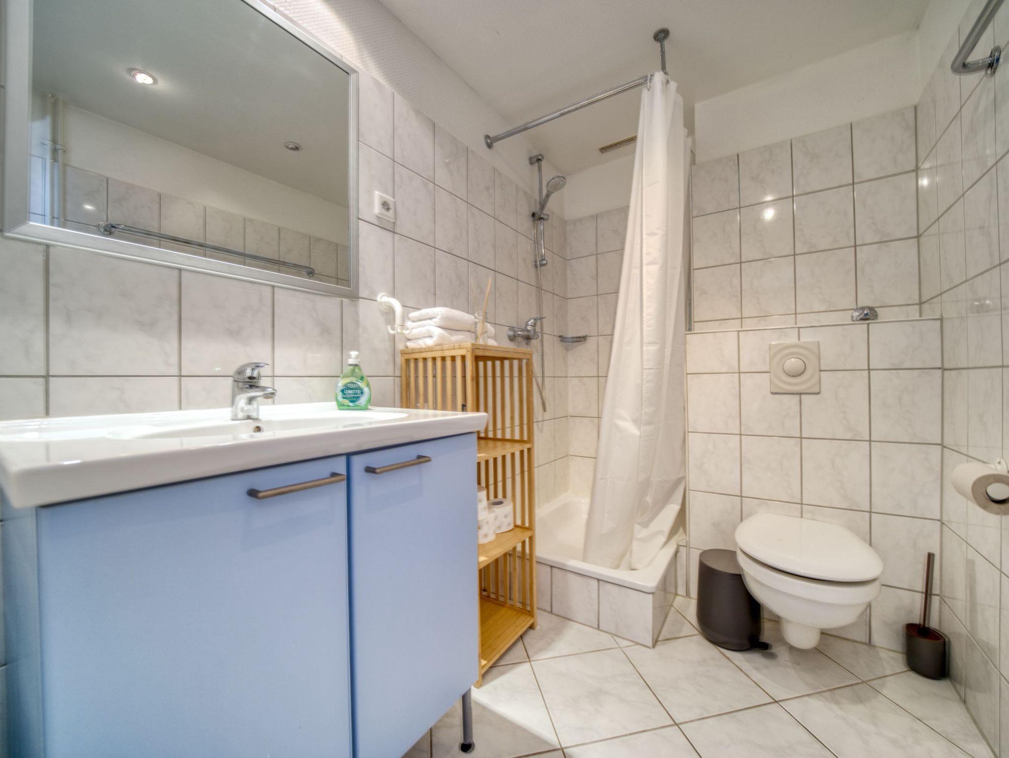 Freundliches Badezimmer mit Duschkabine, WC und Waschbecken