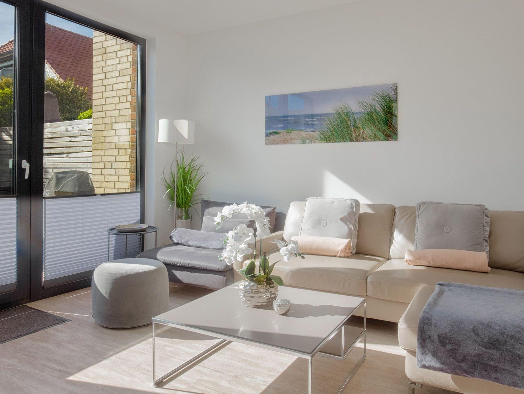 Der stilvolle Wohnbereich mit großzügiger Sofalandschaft und Hocker lädt nach langen Strandtagen oder ausgedehnten Spaziergängen zum Entspannen ein. Zur Unterhaltung stehen ein TV, WLAN und eine umfangreiche Spielesammlung zur Verfügung ? perfekt für gesellige Abende mit der Familie oder Freunden. Eine Xbox im Wohnzimmer bietet zusätzlichen Spaß für Groß und Klein. Bodentiefe Fenster lassen viel Tageslicht herein und eröffnen einen herrlichen Blick auf das charmante, neu errichtete Feriendorf, das sich harmonisch in die klassische Ostsee-Architektur einfügt.