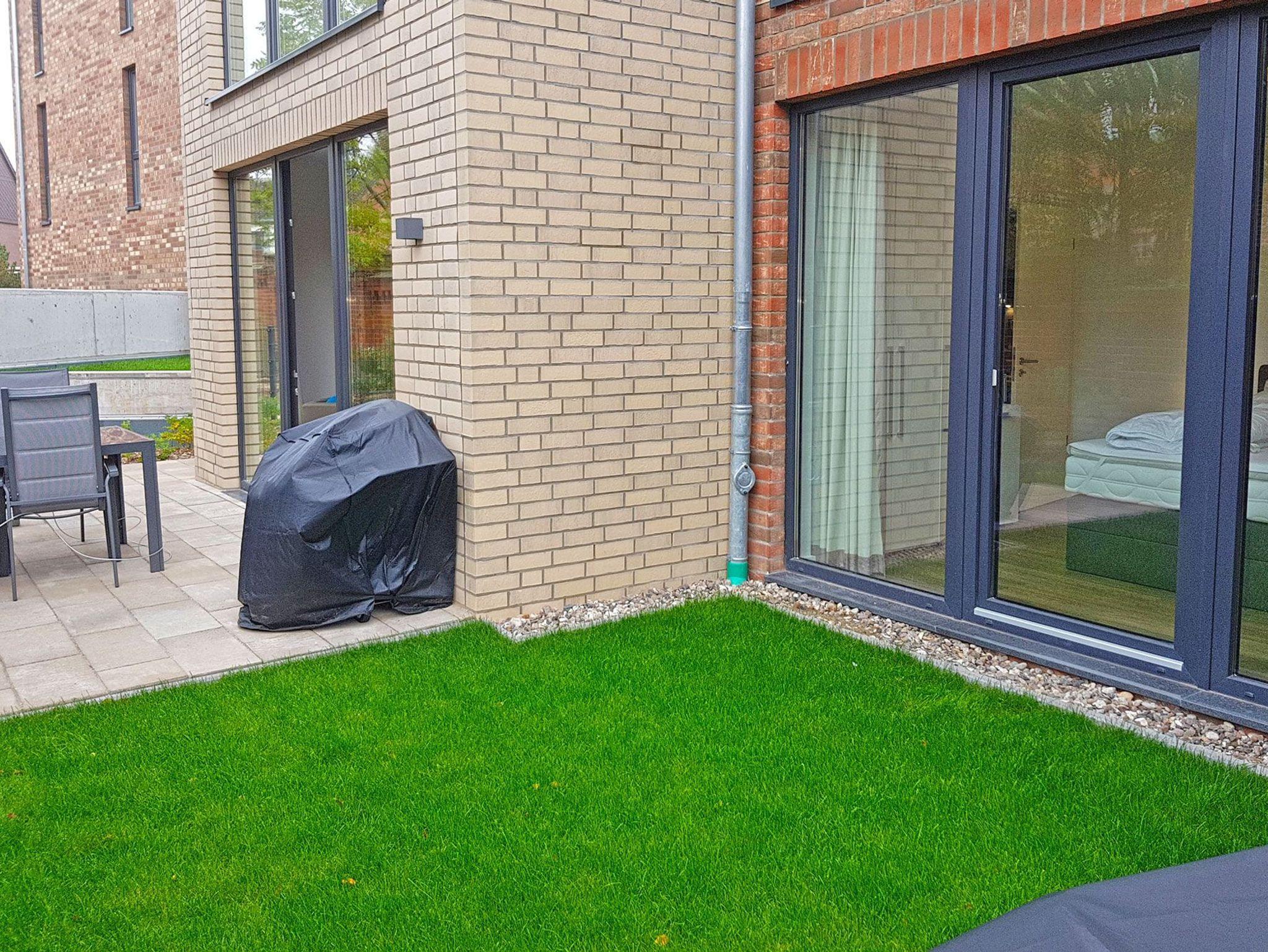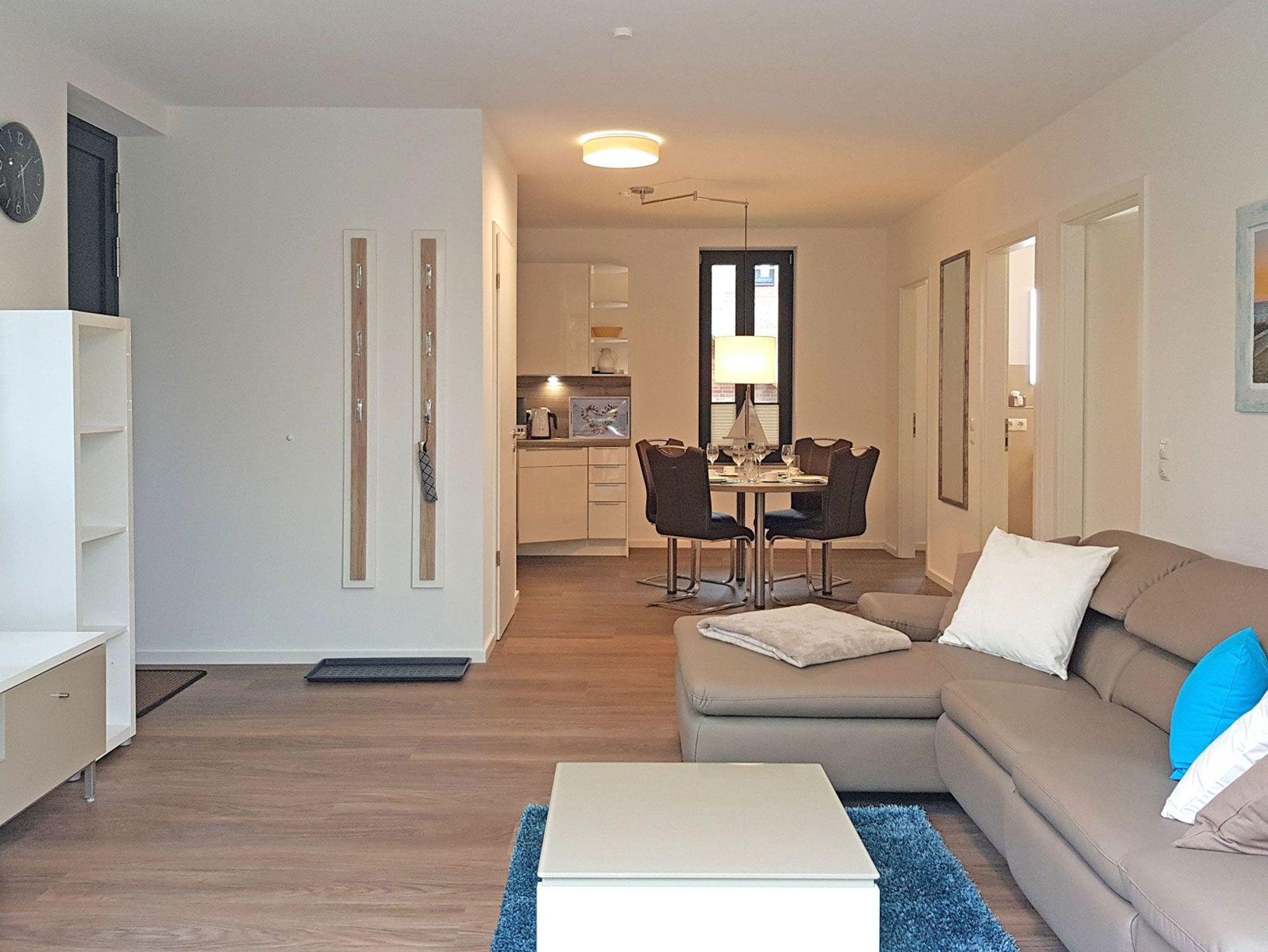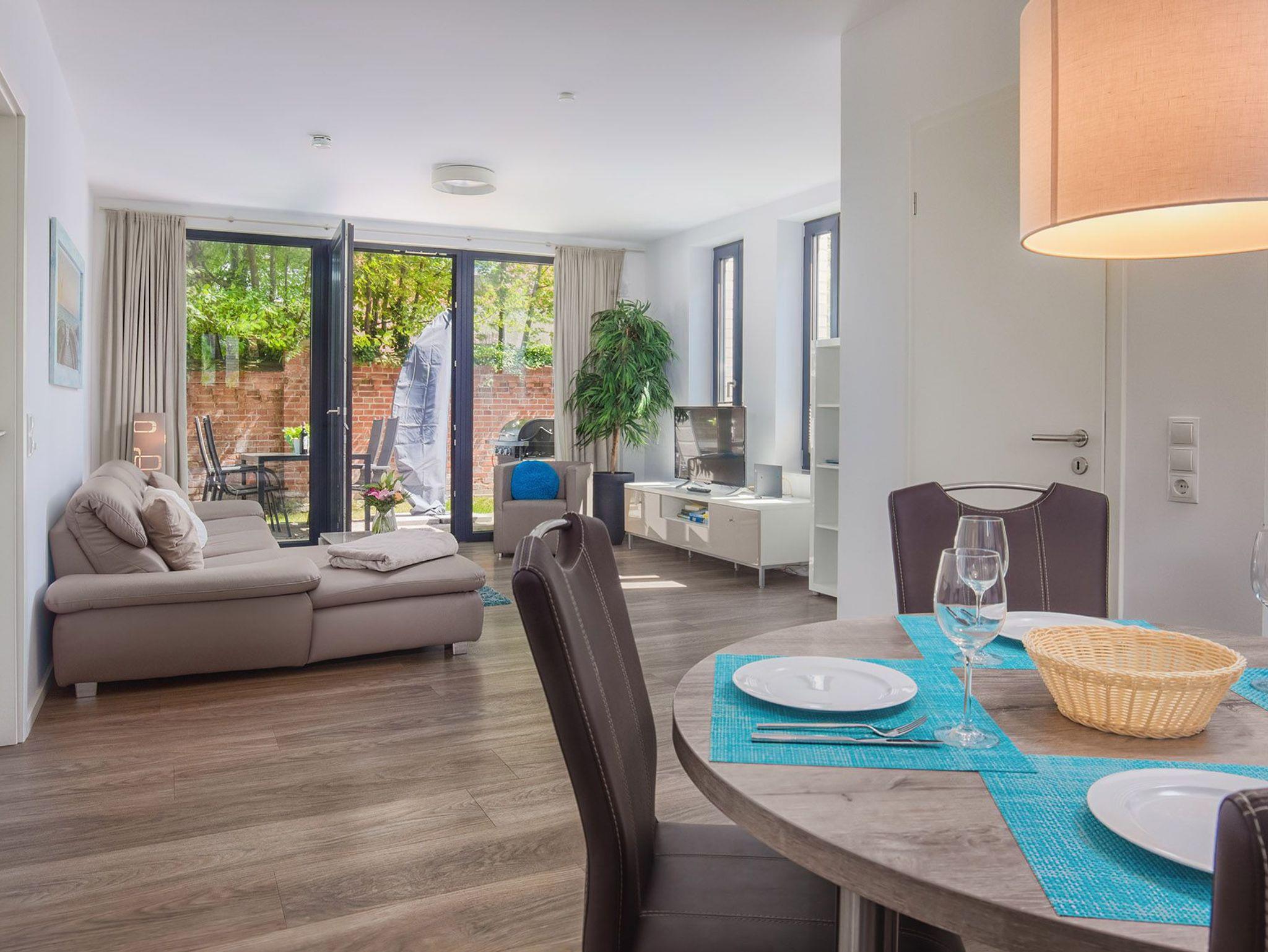 Der gemütliche Wohnbereich ist mit einer bequemen Couch, HD-TV und WLAN ausgestattet. Große, bodentiefe Fenster lassen viel Tageslicht in die Wohnung und bieten einen schönen Blick auf die möblierte Terrasse mit Grill und den nutzbaren Gartenbereich ? der perfekte Ort für entspannte Stunden an der frischen Ostseeluft.