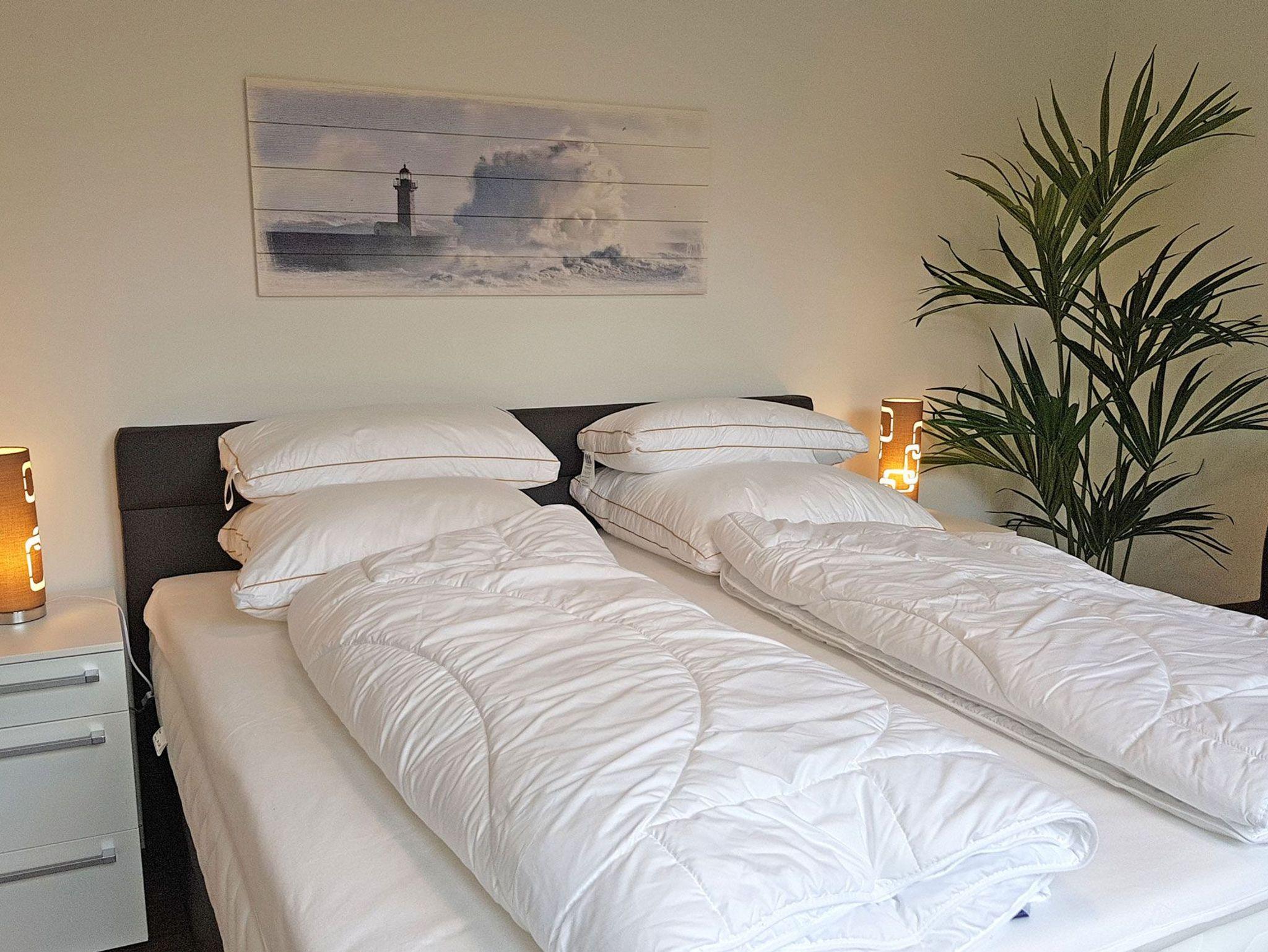 Die Ferienwohnung ist ideal für kleine Familien oder Paare, da sie über zwei Schlafzimmer mit komfortablen Doppelboxspringbetten verfügt. Allergiker-geeignete Bettwäsche und Handtuchsets können gegen Gebühr geliehen werden. Ein Baby-Reisebett und ein Hochstuhl gehören ebenfalls zur Ausstattung. Für angenehme Verdunklung und erholsame Nächte sorgen Vorhänge und Plissees.