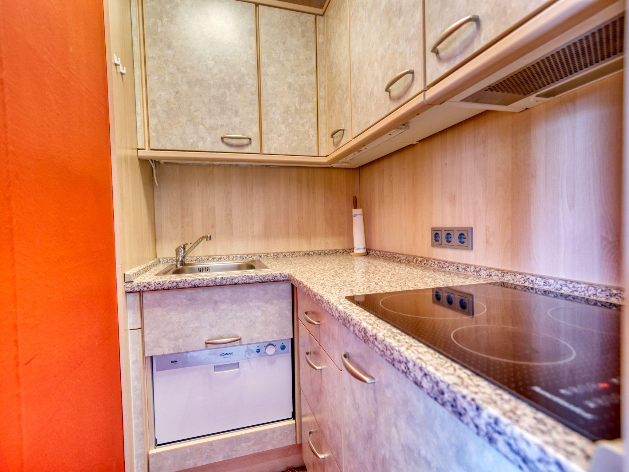 Küchenzeile mit Mikrowelle, Mini-Backofen, Geschirrspüler, Kühlschrank und Filterkaffeemaschine