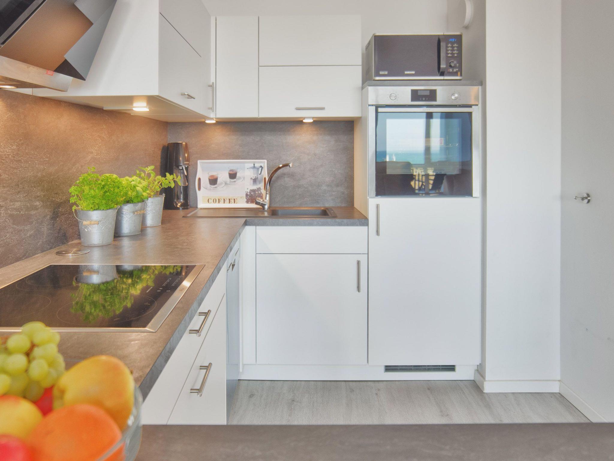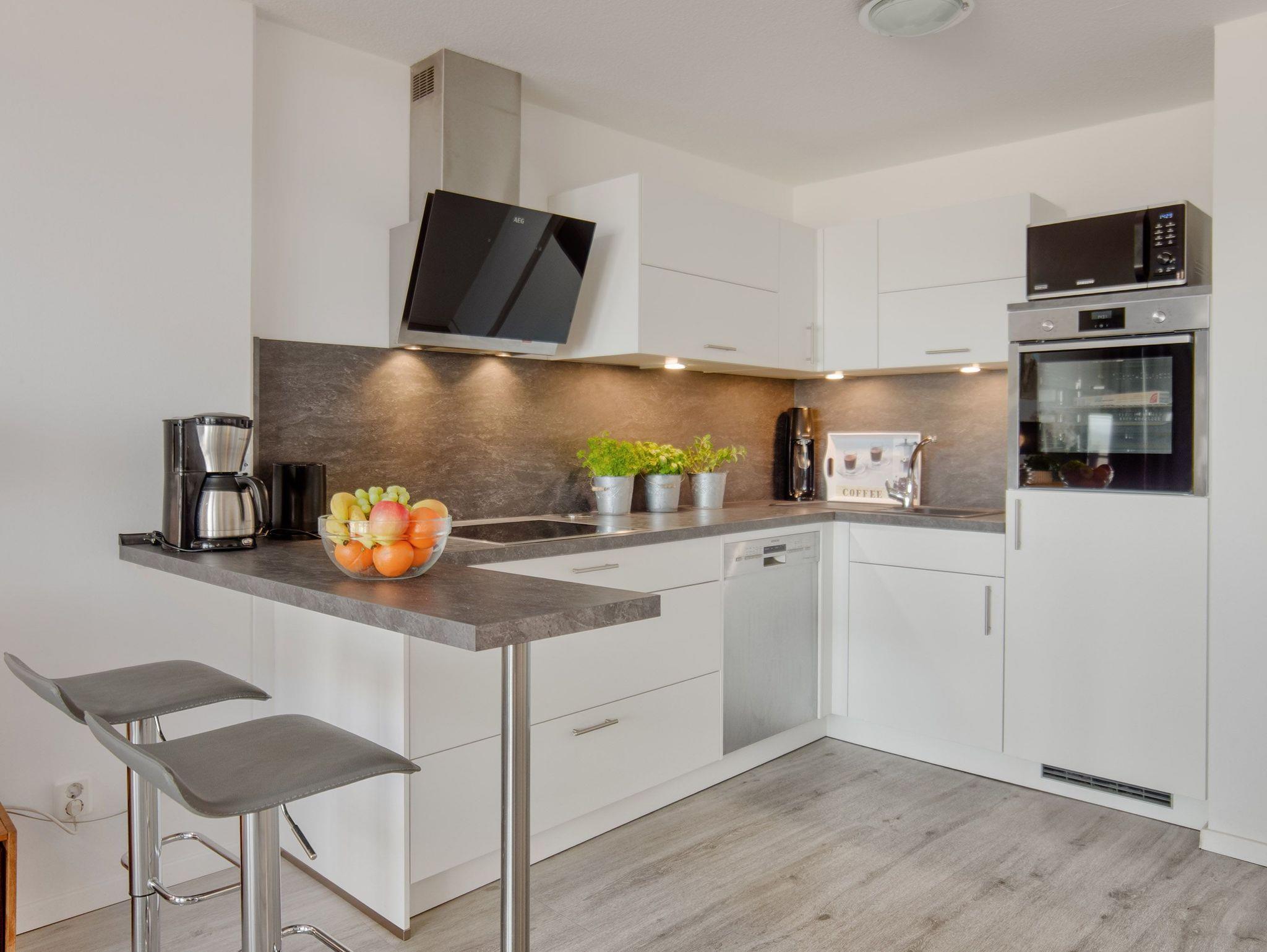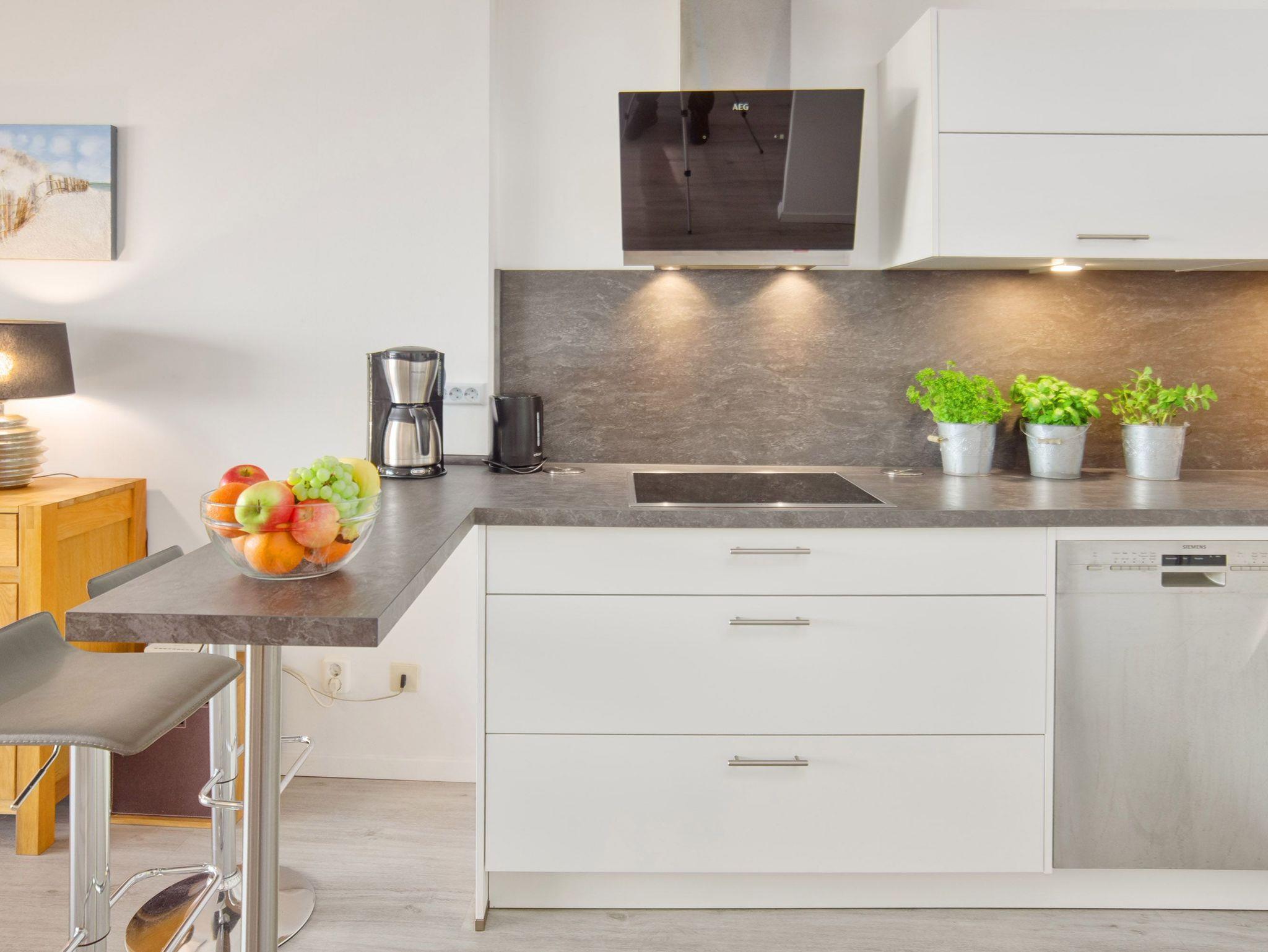 Die moderne und offene Küche mit Vollausstattung lässt keine Wünsche offen. Komfortabel steht dort zudem ein Bistrotisch mit Barhockern für den kleinen Snack zur Verfügung.