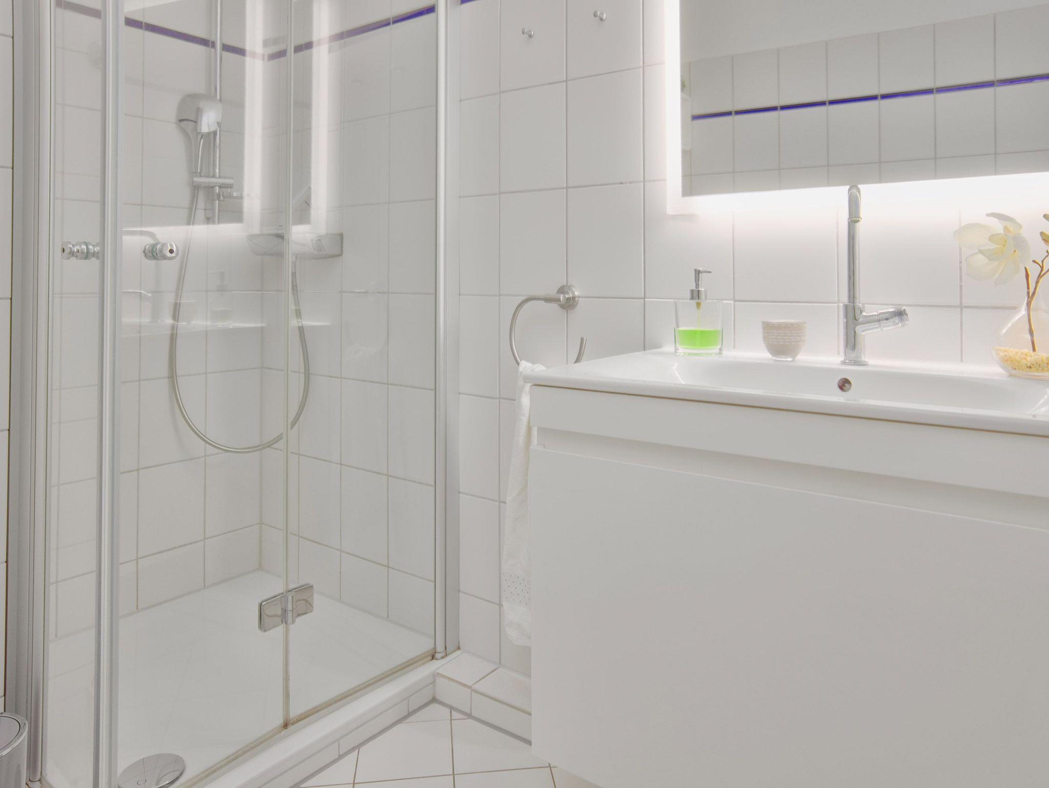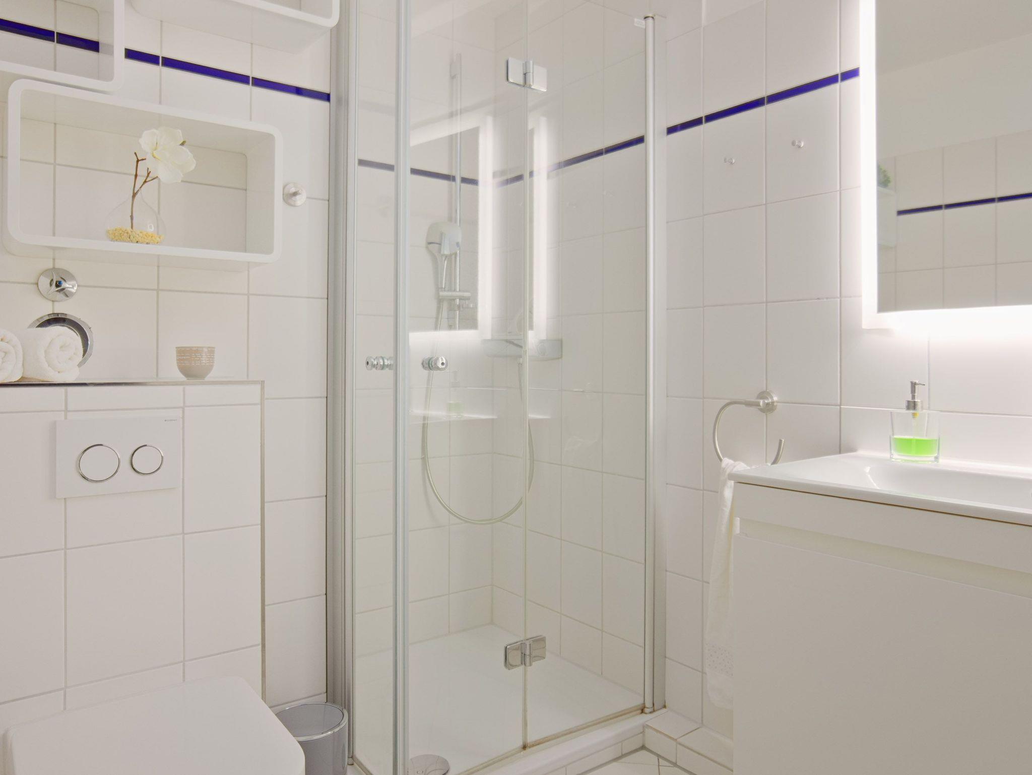 Das hochwertige, moderne Badezimmer ist mit einer geräumigen Dusche, einem beleuchteten Spiegel, einem Handtuchwärmer und einem Föhn ausgestattet ? perfekt für einen angenehmen Start in den Tag.