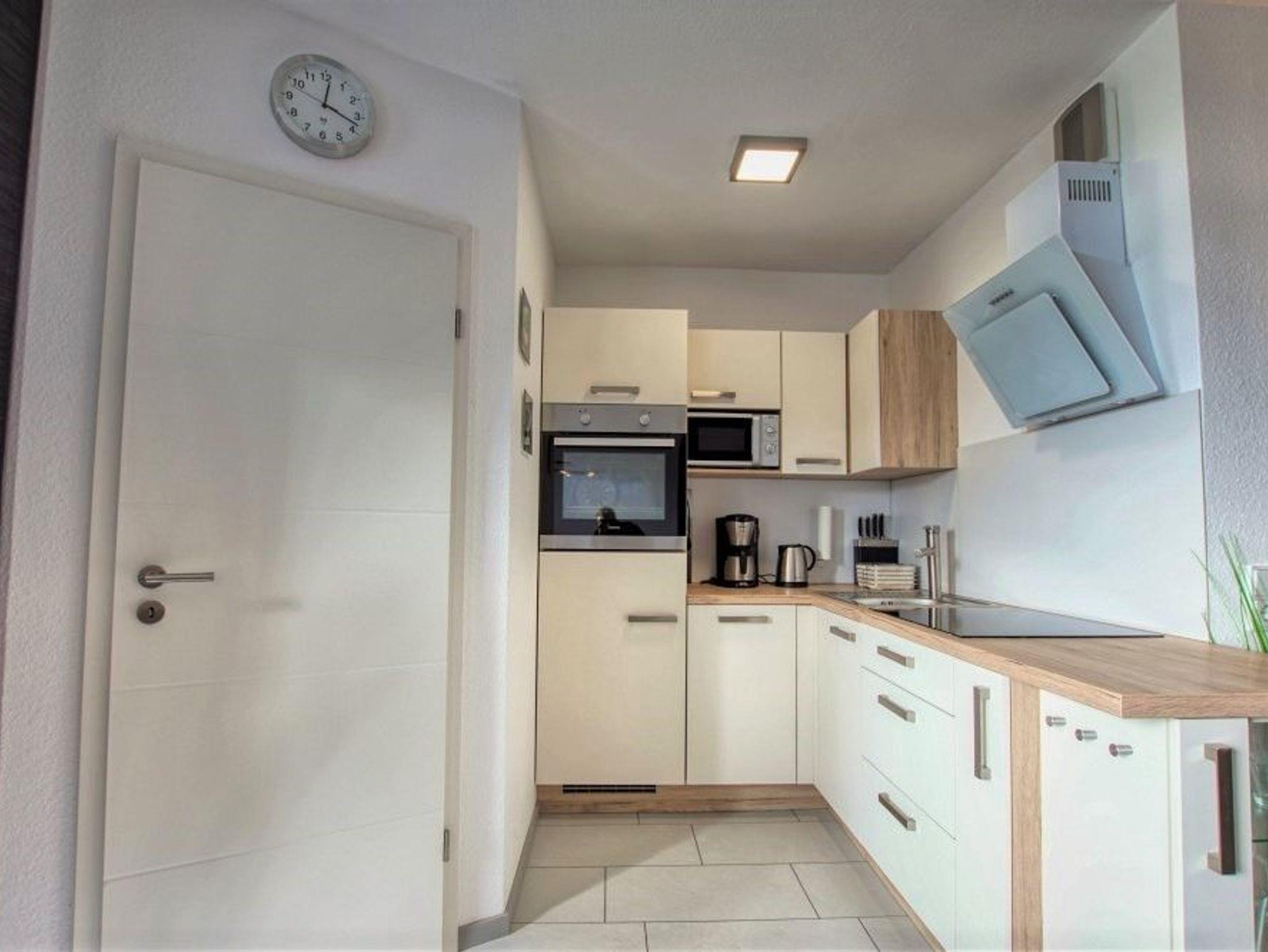 Komplett eingerichtete, neue Küche mit Kühlschrank, Backofen, Geschirrspüler, 4-Platten-Ceranfeld, Wasserkocher und Toaster
