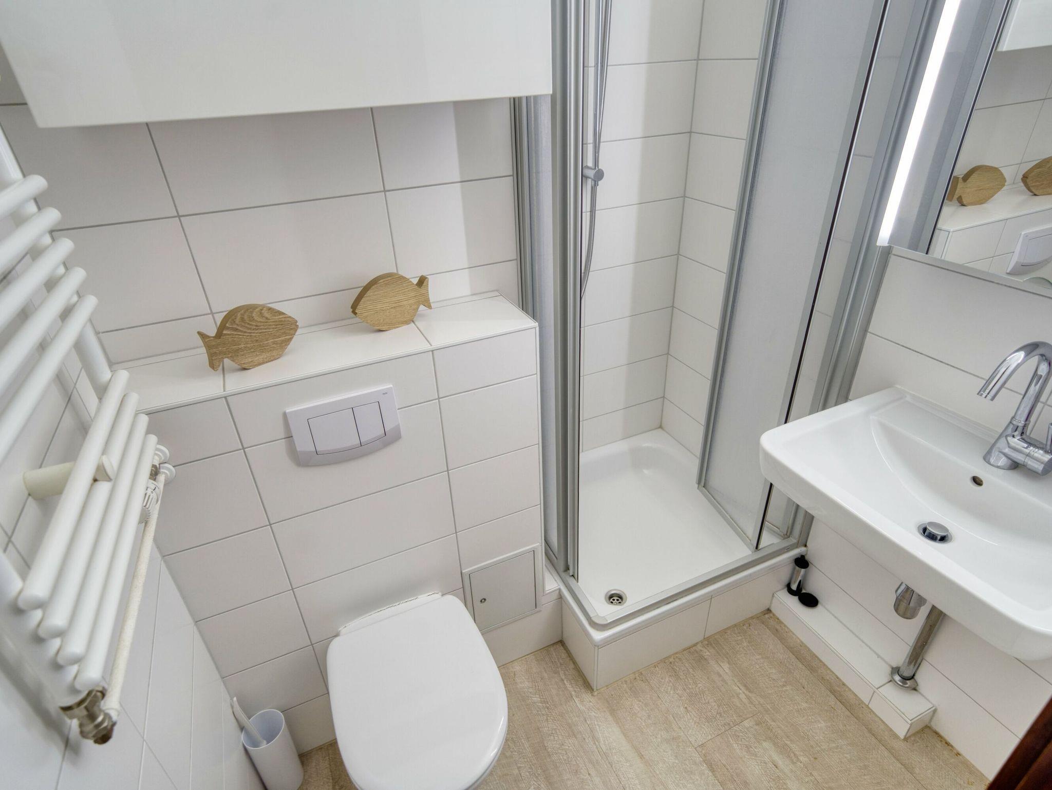 Badezimmer mit Duschkabine, WC und Handtuchtrockner