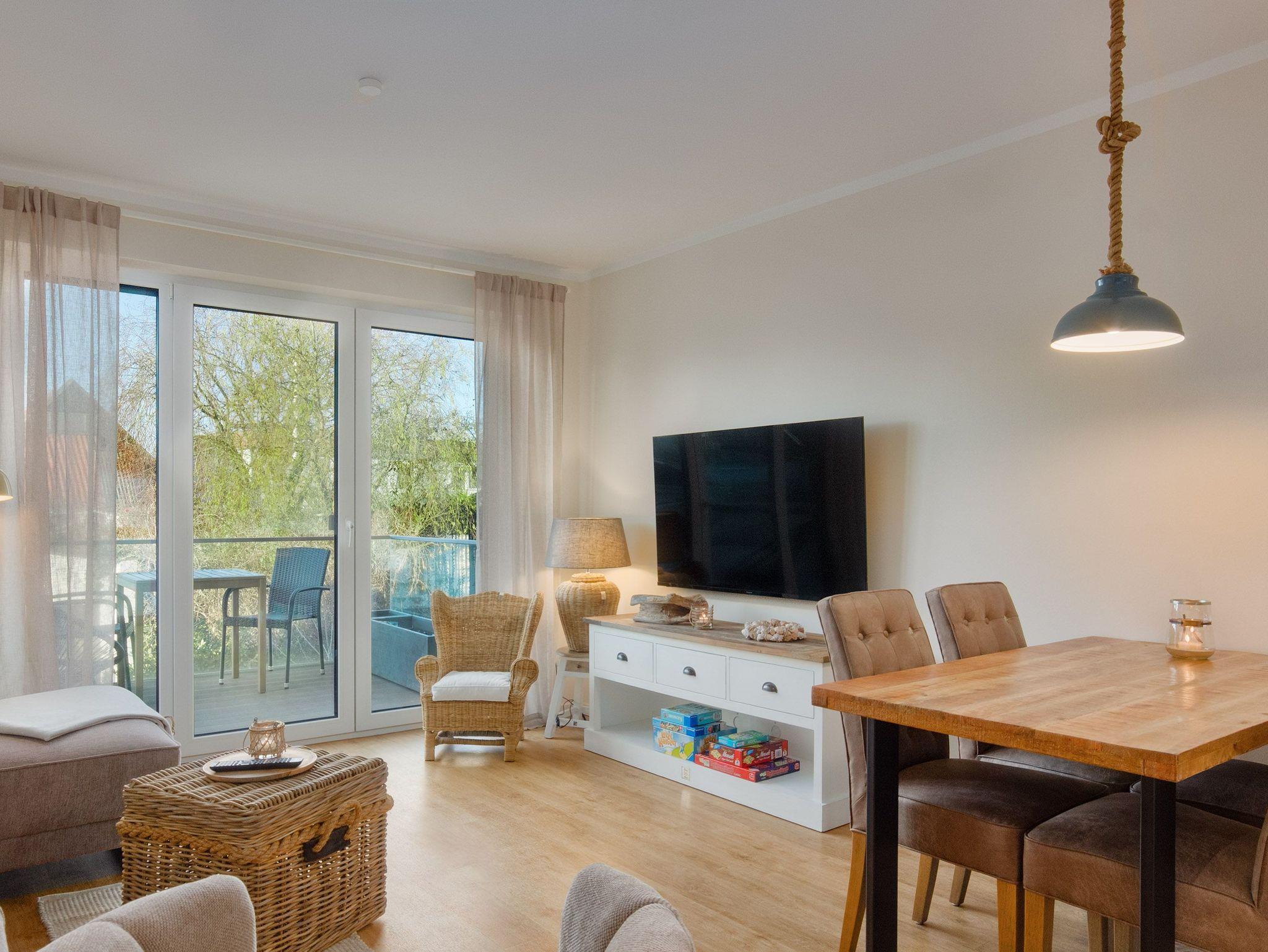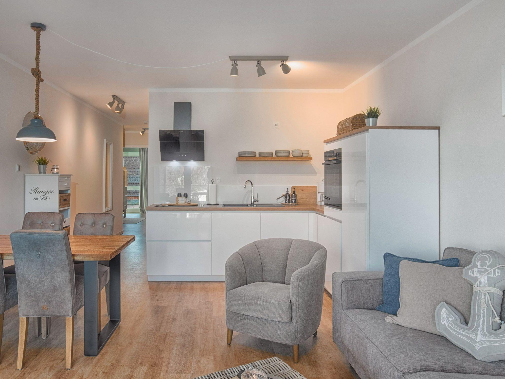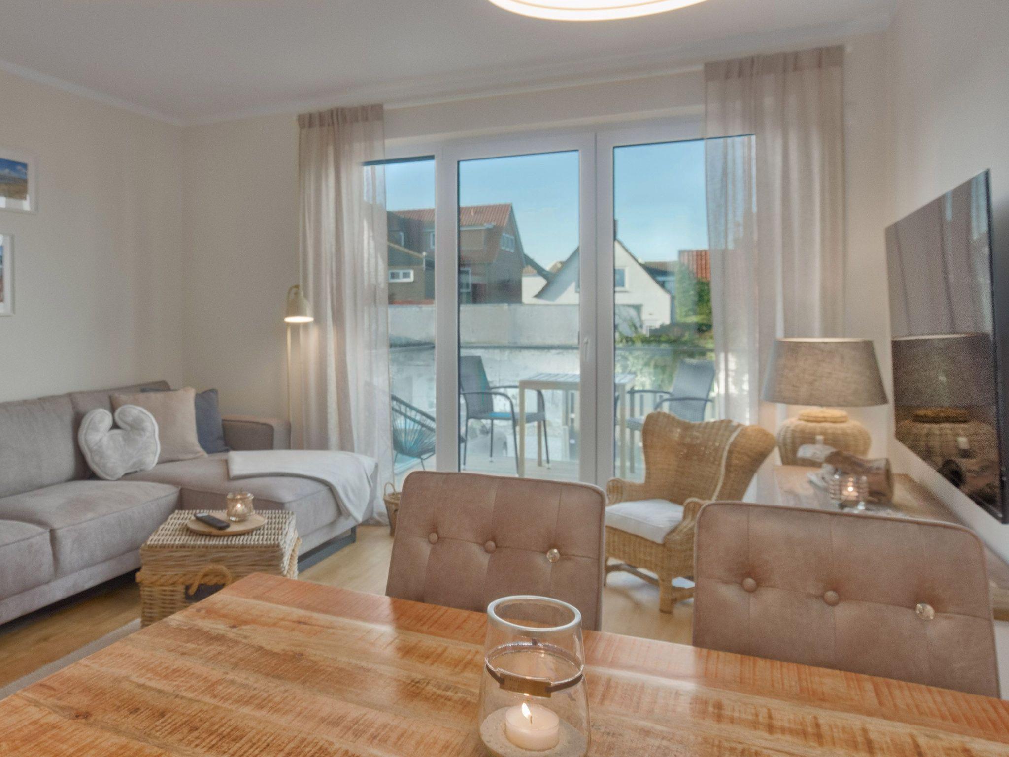 Exklusive Ferienwohnung Hygge Ahoi in Heiligenhafen mit modernem Wohnbereich, Balkon und Blick auf die Hafenanlage.