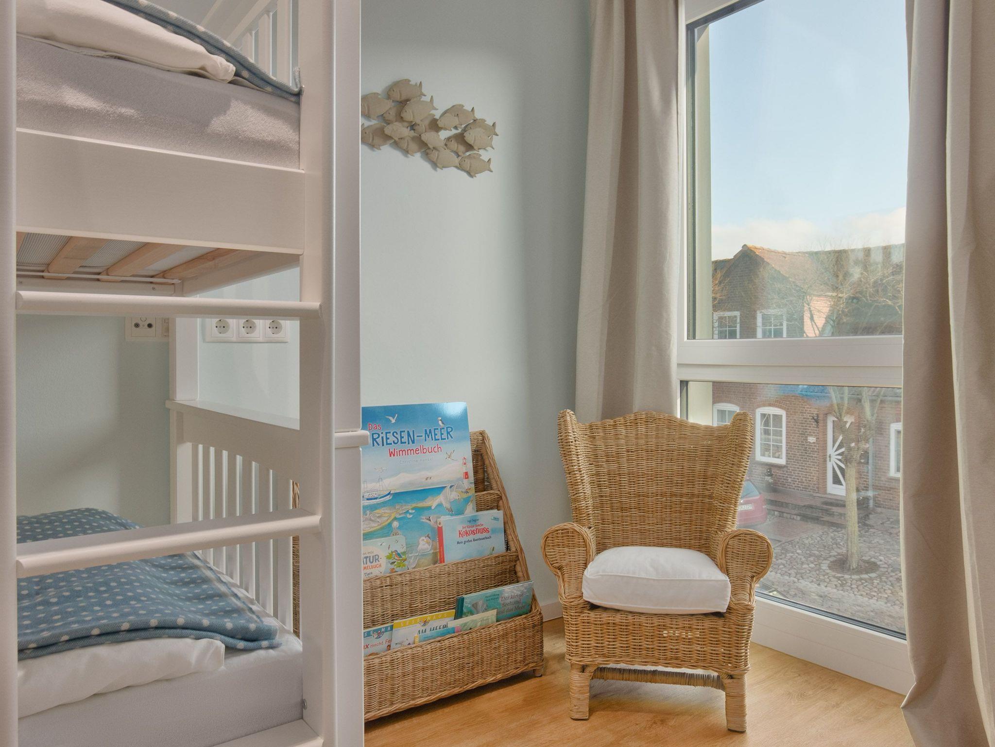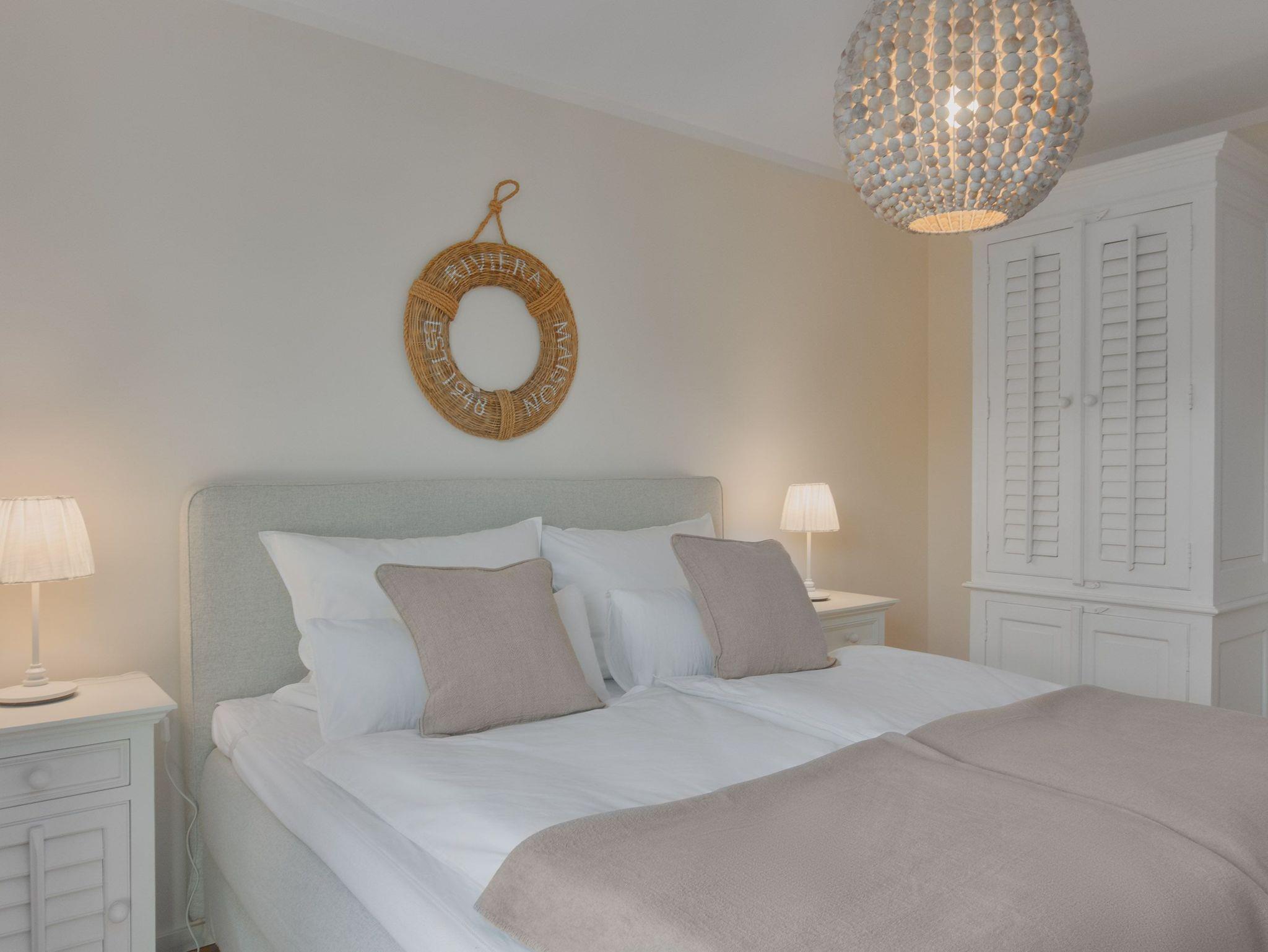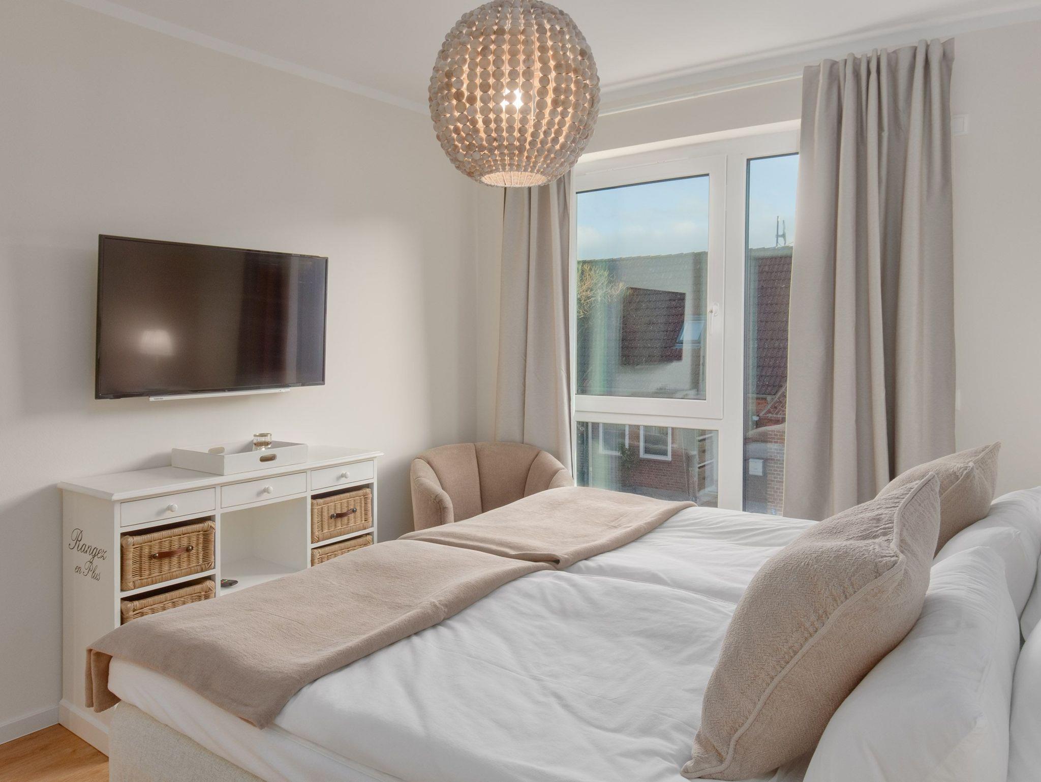 Ebenso komfortabel geht es im ersten Schlafzimmer der Wohnung weiter. Hier wartet ein einladendes Doppelboxspringbett (180x200) und TV. Das zweite Schlafzimmer hat ein Etagenbett (90x200, maximal 120kg je Liegefläche, optimal für Kinder).