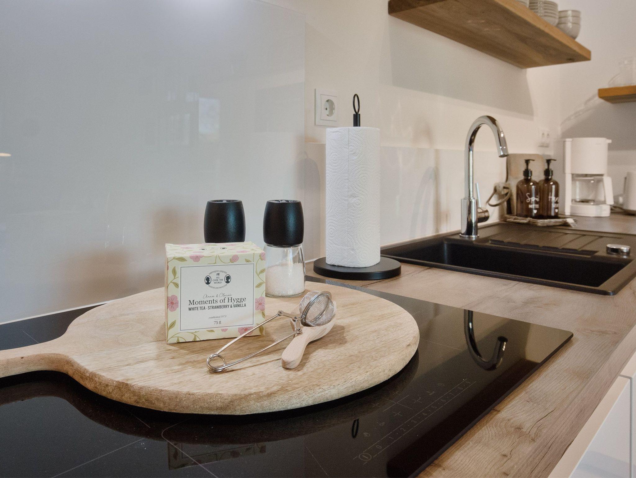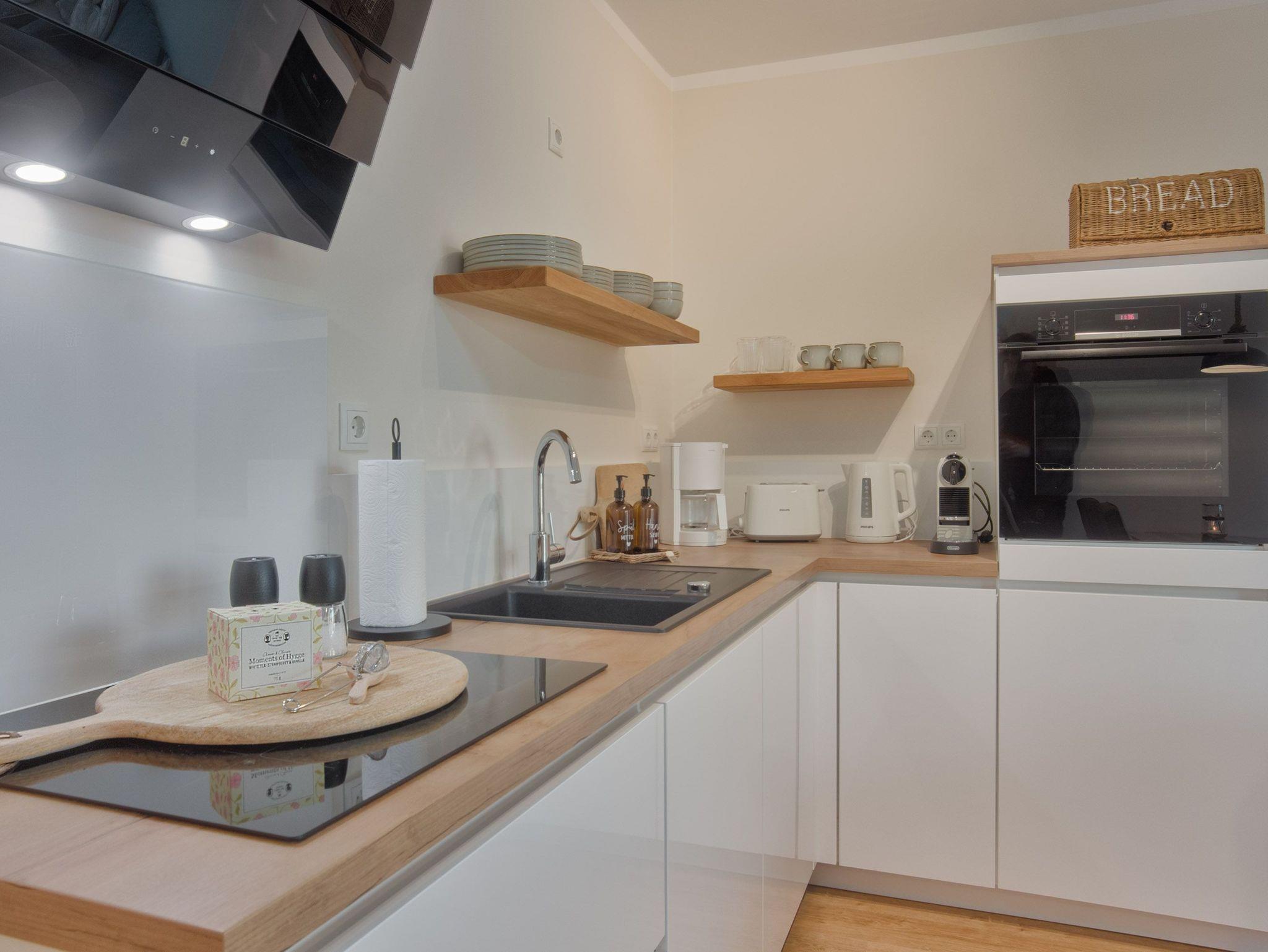 Auch die Küchenzeile wurde in den Wohnbereich integriert. Modern und durchdacht gestaltet, bietet Ihnen die Einbauküche alle Annehmlichkeiten für eine sorgenfreie Selbstversorgung.