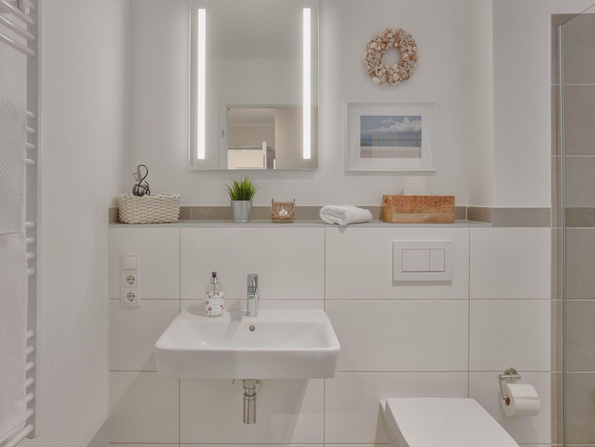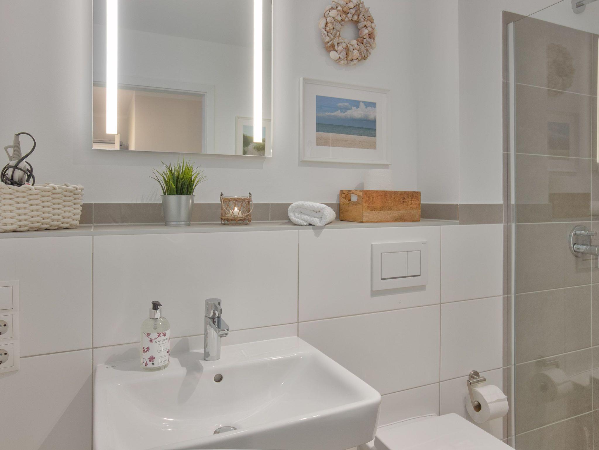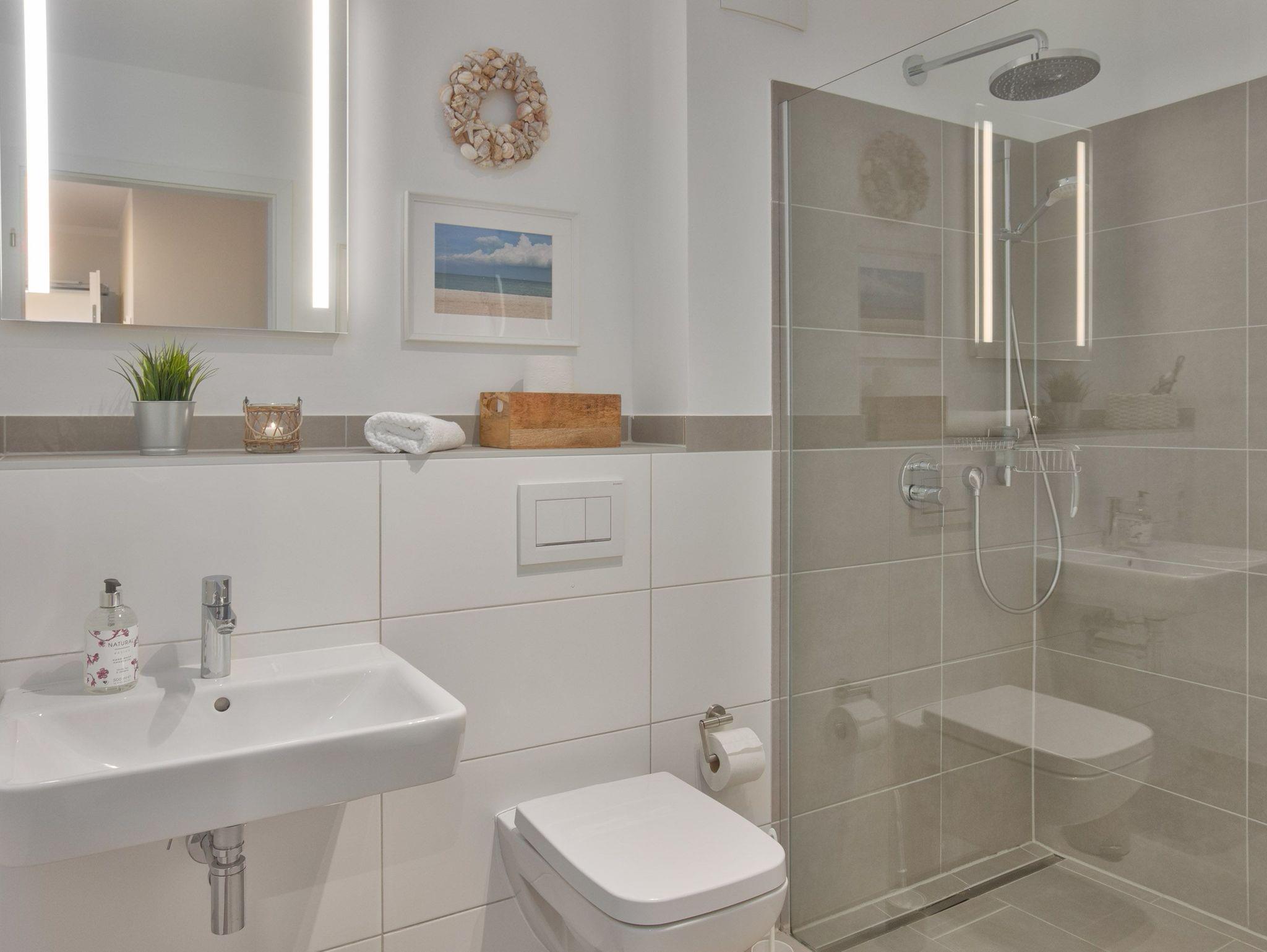 Das gut geschnittene, moderne Duschbad direkt neben den Schlafzimmern sorgt für weitere Bequemlichkeit. Die ebenerdige Dusche, WC, Waschbecken, Spiegel und Handtuchwärmer runden den Raum ab. Im kleinen Abstellraum ist zudem eine Waschmaschine verfügbar.