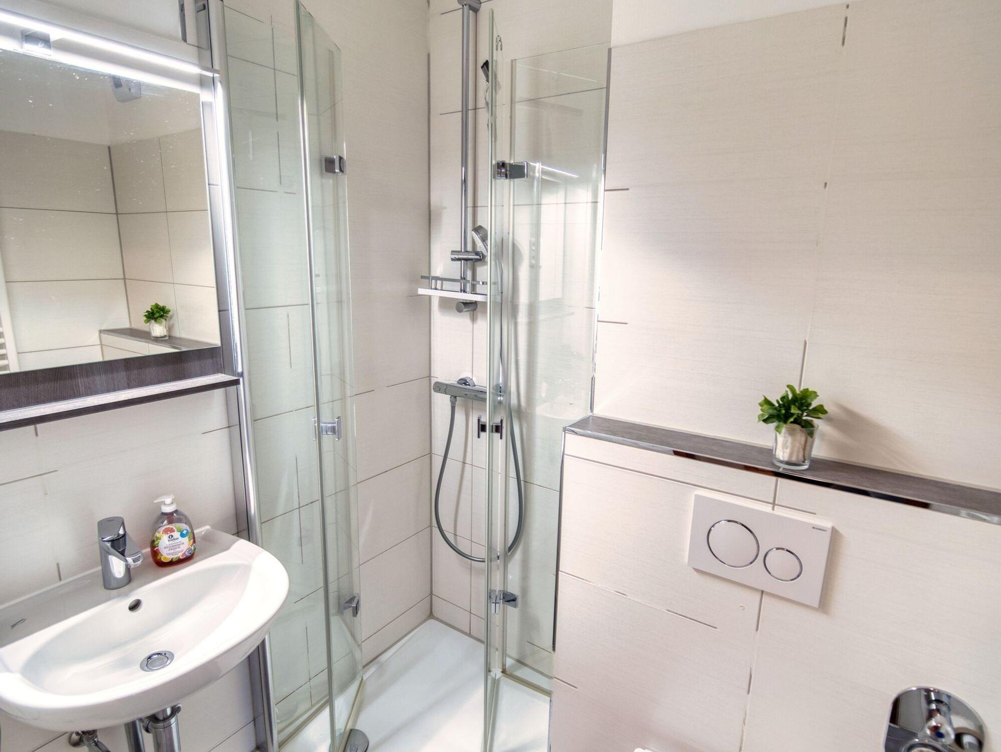Badezimmer mit Duschkabine (niedriger Einstieg), Handtuchtrockner und WC