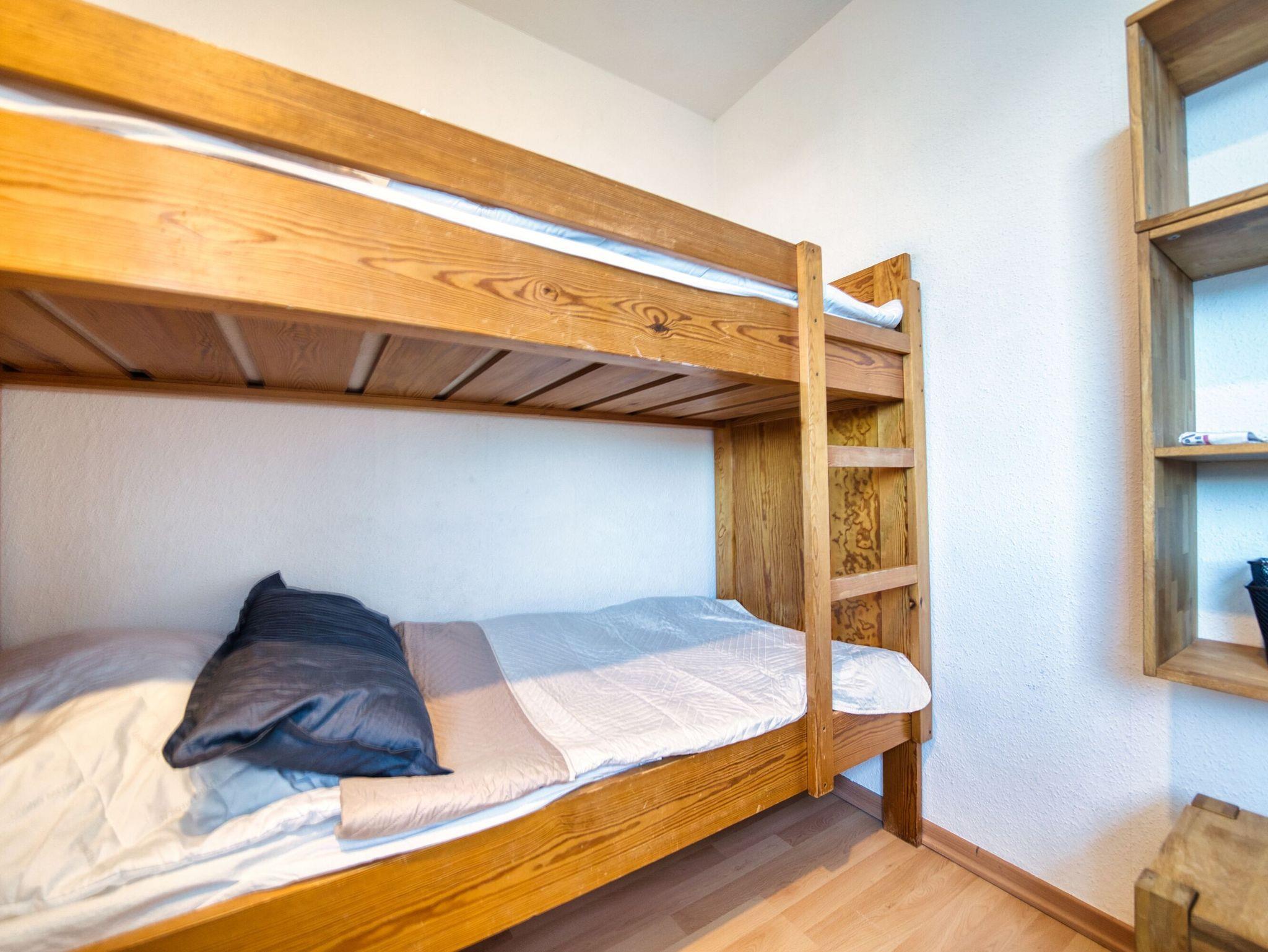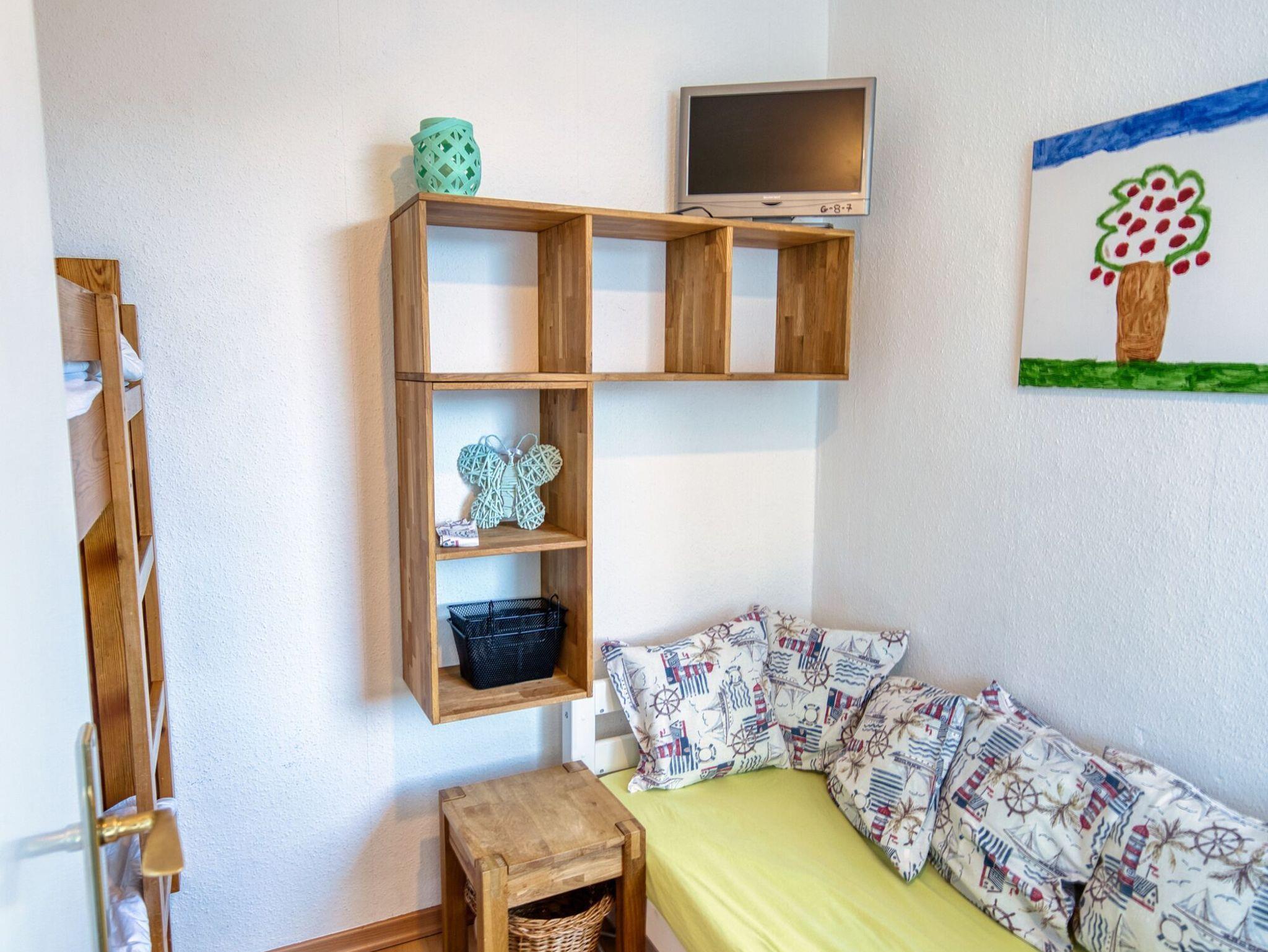 Schlafzimmer mit Etagenbett, Kinderbett (160 x 70 cm, Bettzeug mit normaler Größe) und eigenem TV (nur für DVDs, kein Kabelanschluss)