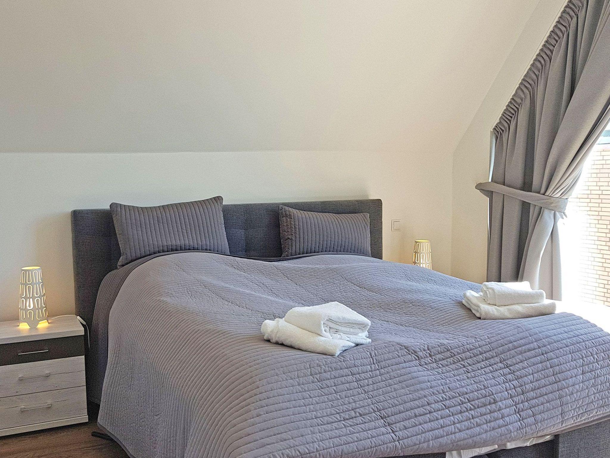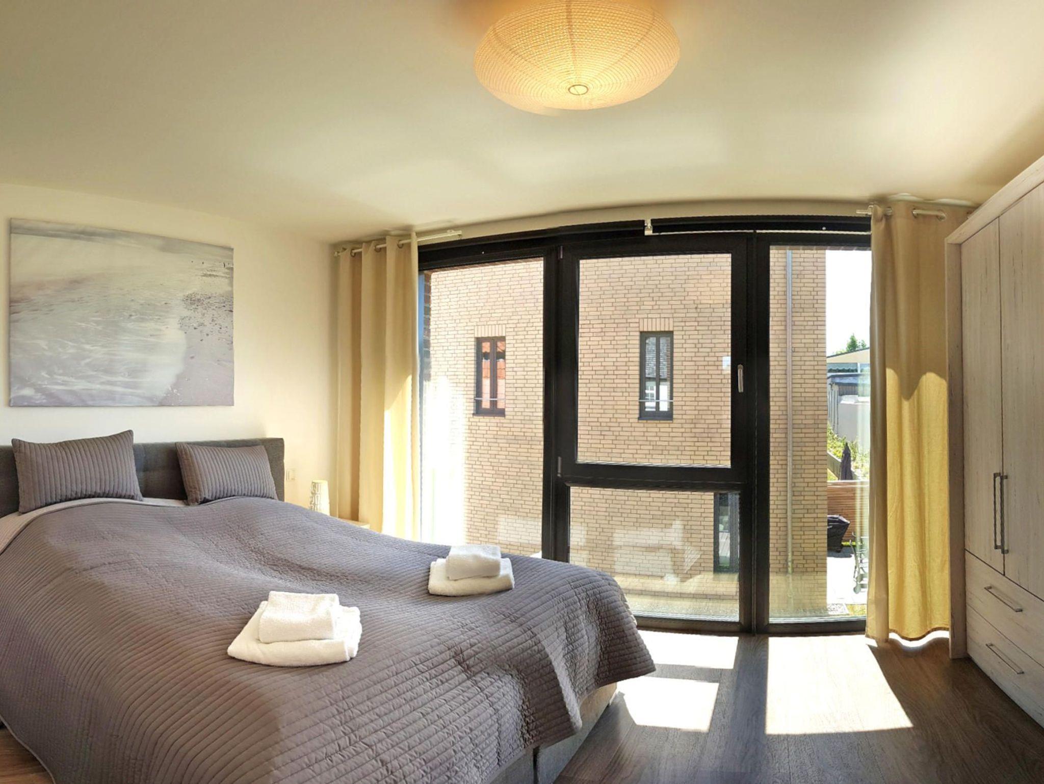 Die Schlafräume sind so gestaltet, dass sie Komfort bieten. Im ersten Obergeschoss erwartet Sie ein gemütliches Schlafzimmer mit einem Doppel-Boxspringbett. Das Dachgeschoss verfügt über ein weiteres Schlafzimmer mit Doppel-Boxspringbett sowie ein zusätzliches Zimmer mit zwei einzelnen Boxspringbetten. Besonders praktisch: Alle Betten sind elektrisch verstellbar und ermöglichen somit eine individuelle Liegeposition für erholsamen Schlaf. Für Kleinkinder stehen Babyreisebetten (gegen Gebühr) sowie ein Hochstuhl bereit. Bodentiefe Fensterfronten sorgen für eine freundliche und helle Atmosphäre, während Verdunklungsvorhänge und Rollos für erholsame Nächte und Privatsphäre sorgen.