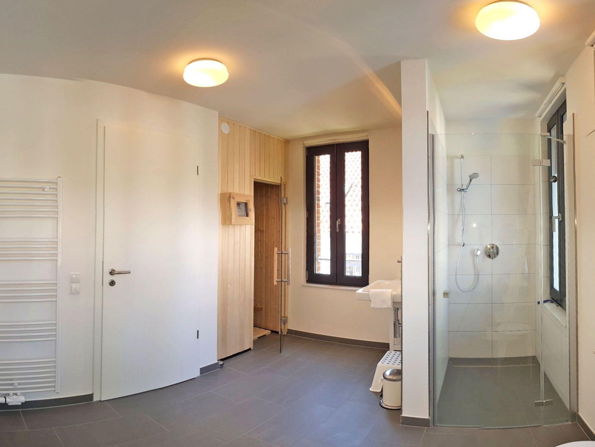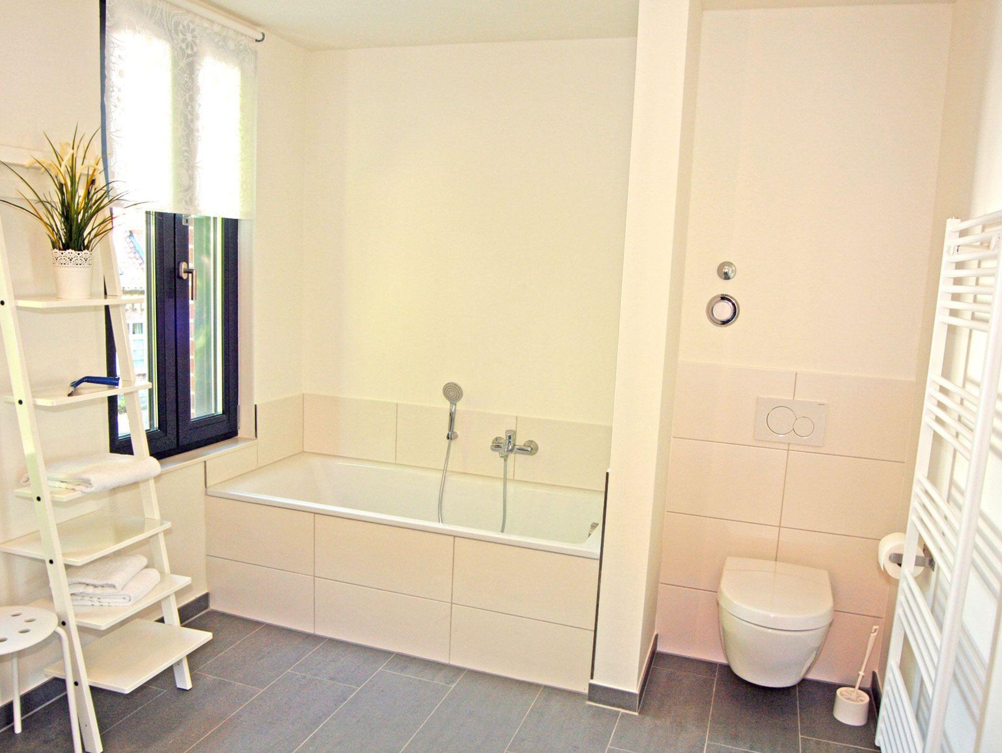Die zwei Badezimmer in den oberen Etagen sind modern ausgestattet. Nach einem erlebnisreichen Tag können Sie im großzügigen Hauptbad mit Sauna (gegen Gebühr), Badewanne oder ebenerdiger Dusche entspannen. Das zweite Badezimmer im Dachgeschoss verfügt über eine Dusche und bietet somit zusätzlichen Raum für die tägliche Pflege. Handtuchwärmer und WC sind in beiden Bädern vorhanden. Im Erdgeschoss sorgt ein zusätzliches Gäste-WC für weiteren Komfort. Das gesamte Haus wird beim Warmwasser über Durchlauferhitzer versorgt.