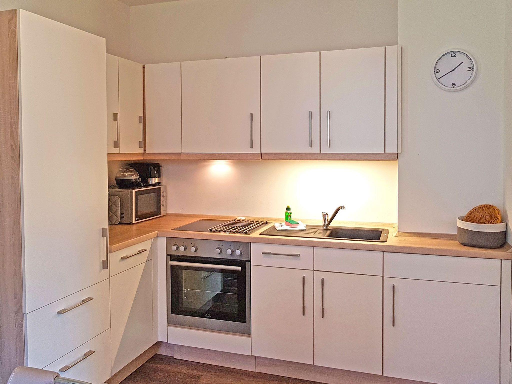 Auch kulinarisch müssen Sie während Ihres Aufenthalts auf nichts verzichten: Die moderne, voll ausgestattete Küche lädt dazu ein, gemeinsam zu kochen und gemütliche Mahlzeiten im angrenzenden Essbereich zu genießen. Direkt neben der Küche befindet sich ein praktischer Abstellraum für Staubsauger und andere Haushaltsutensilien.