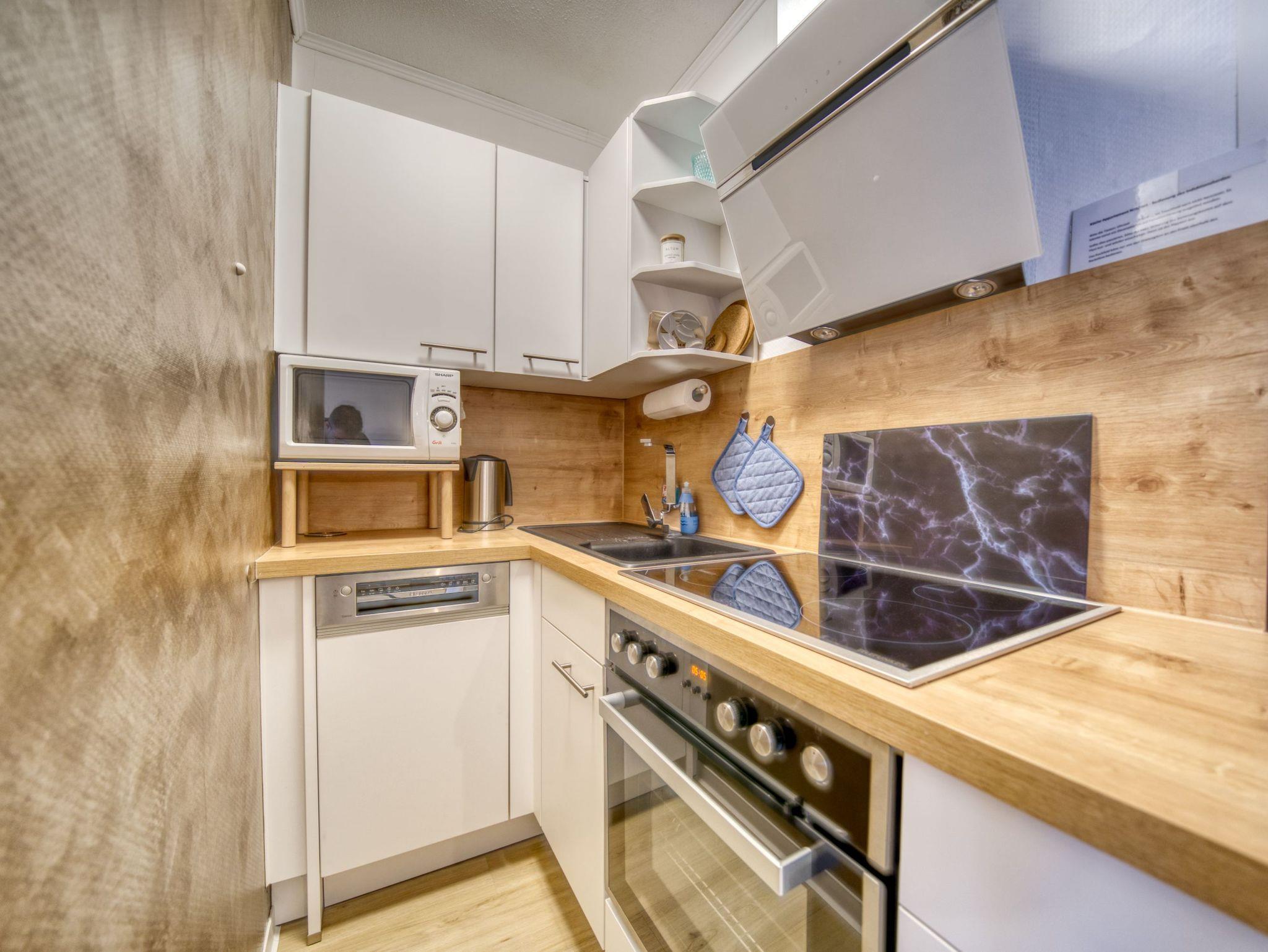 Küchenzeile: Komplett ausgestattet mit Induktionskochfeld, Geschirrspüler und Backofen