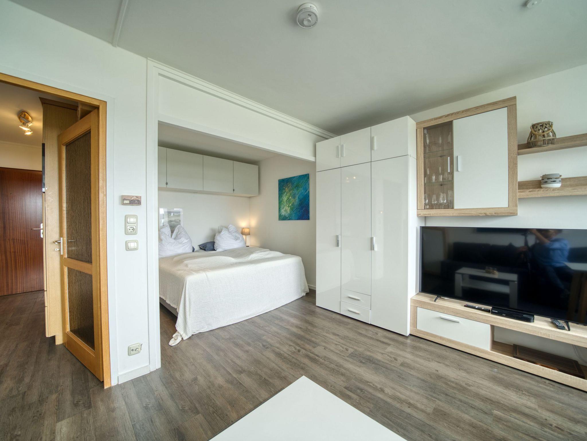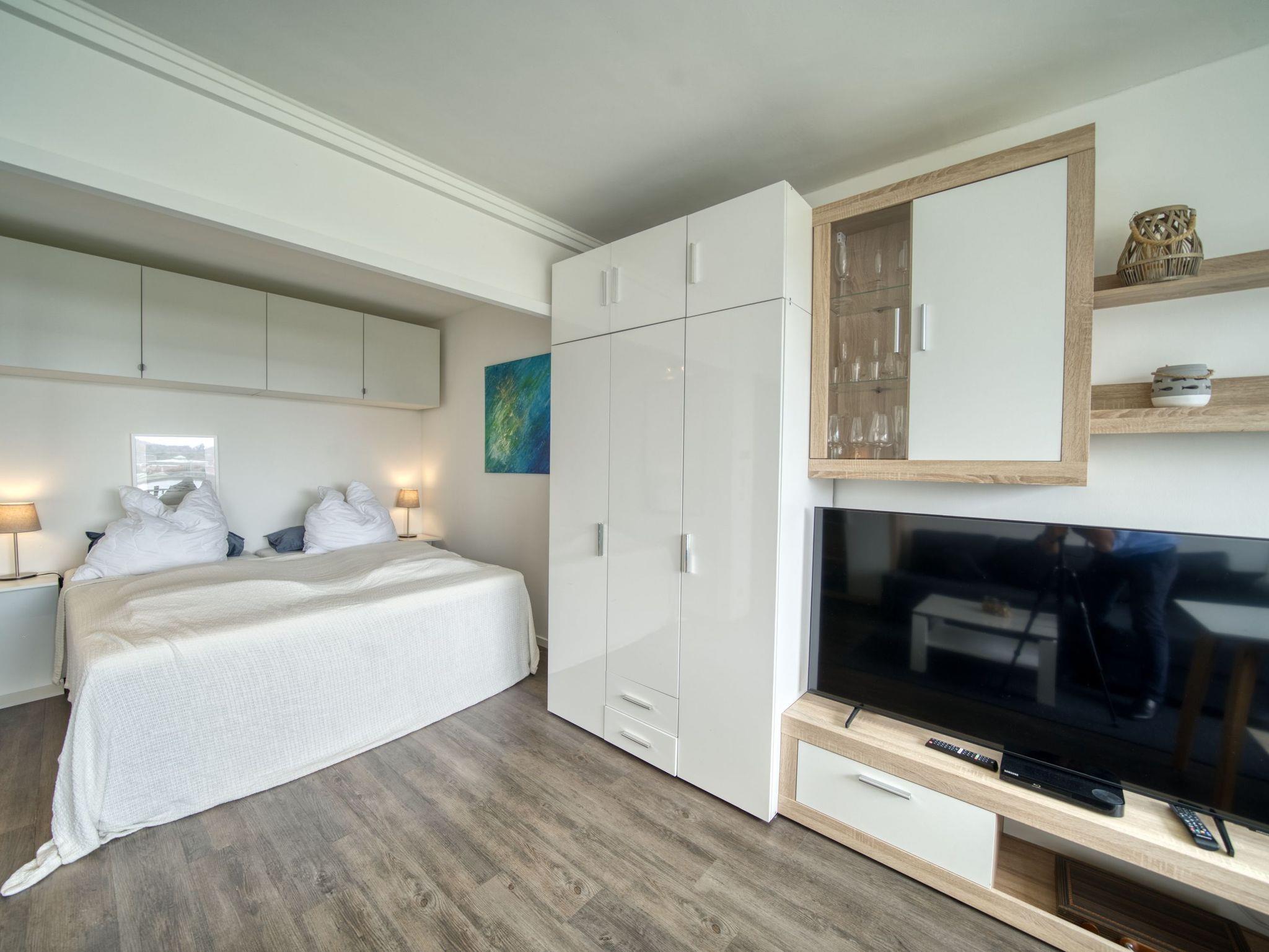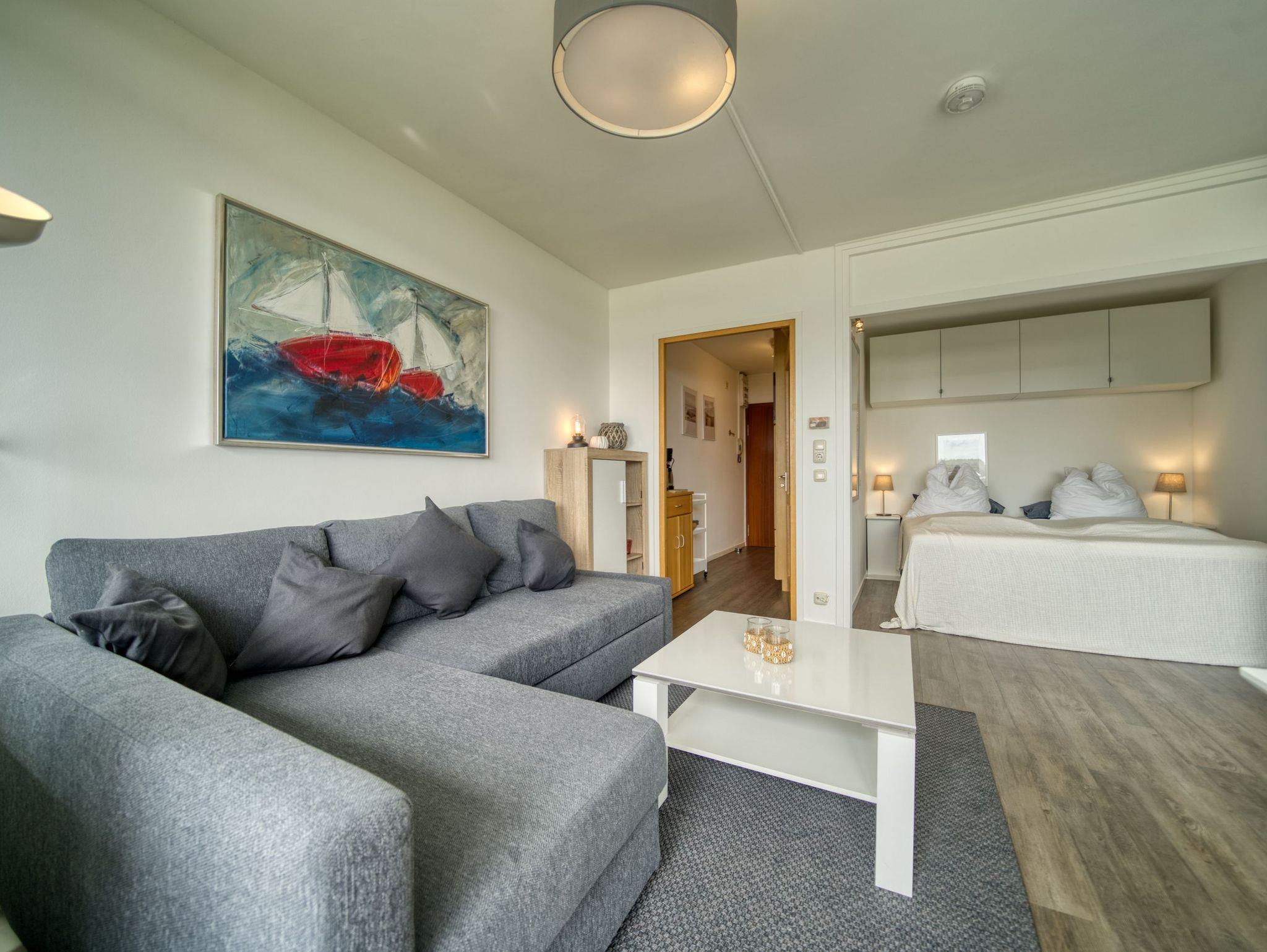 Wohn-/Schlafbereich: Couch, Doppelbett, Kabel-Flat-TV