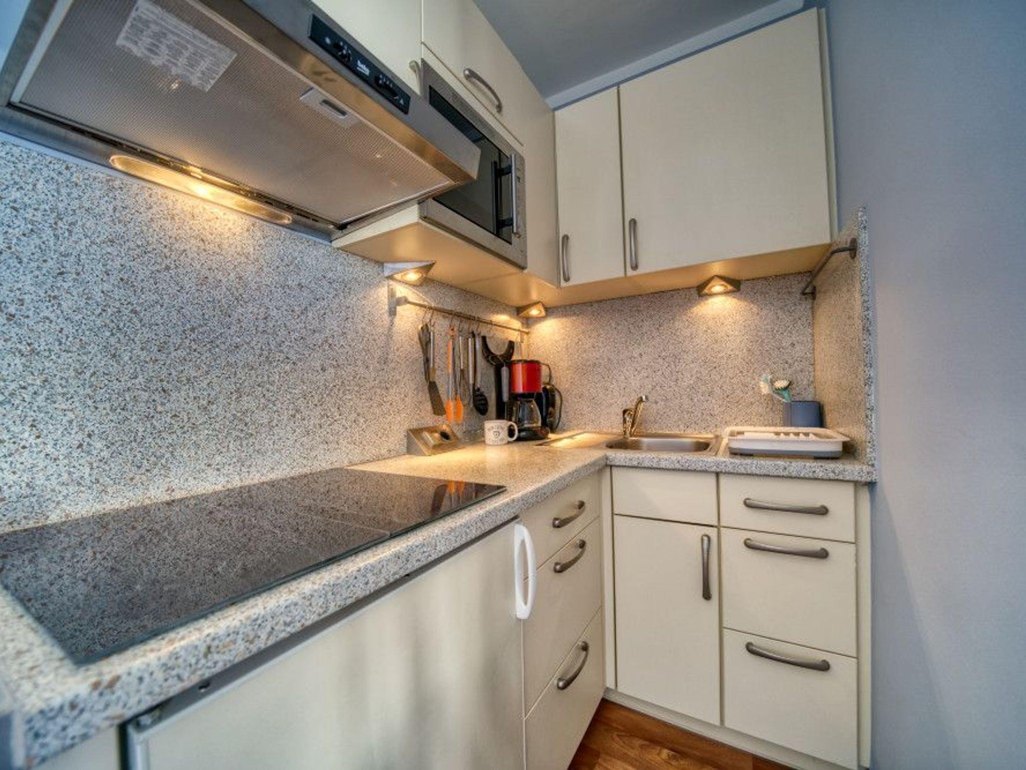 Küche mit 4-Plattenherd, Kühlschrank mit Gefrierfach, Multifunktionsgerät (Mikrowelle mit Back-/Grillfunktion