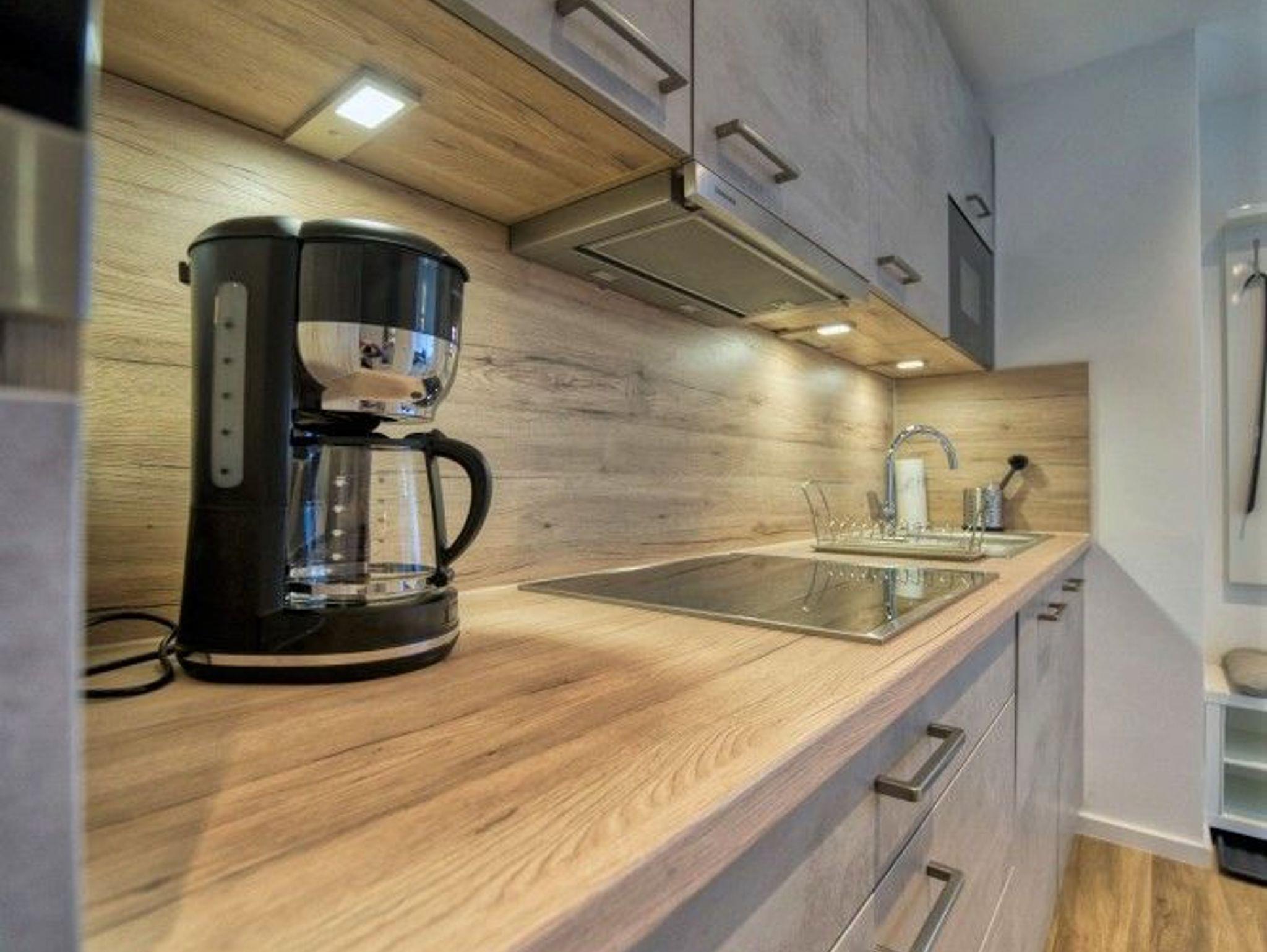voll ausgestattete Küche mit Herd, Kühlschrank, Geschirrspüler, Mikrowelle, Kaffeemaschine [&] Kochutensilien