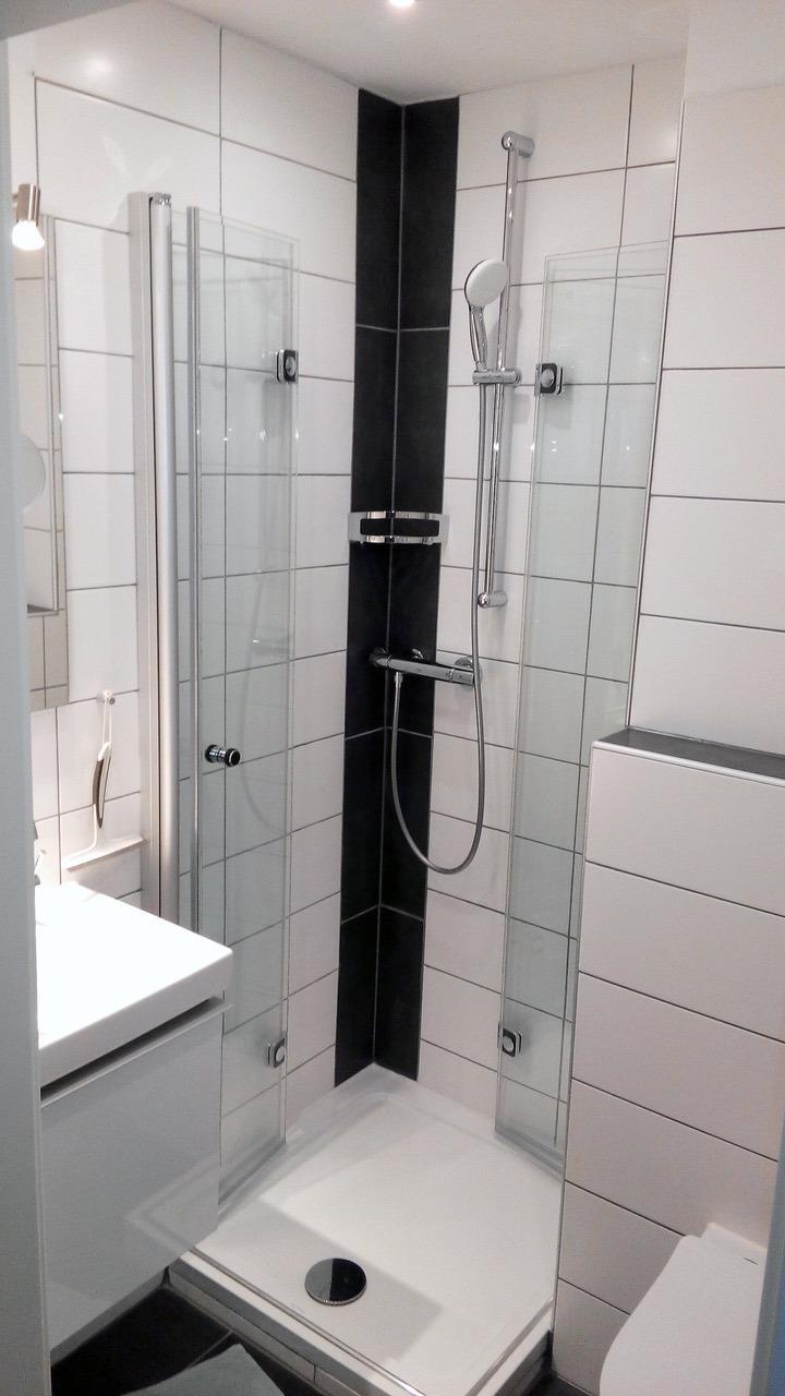 Das modernisierte Duschbad verfügt über einen bodengleichen Einstieg, einen beheizbaren Handtuchhalter und einen Haartrockner. Im Flur befindet sich ein großzügiger Kleiderschrank.