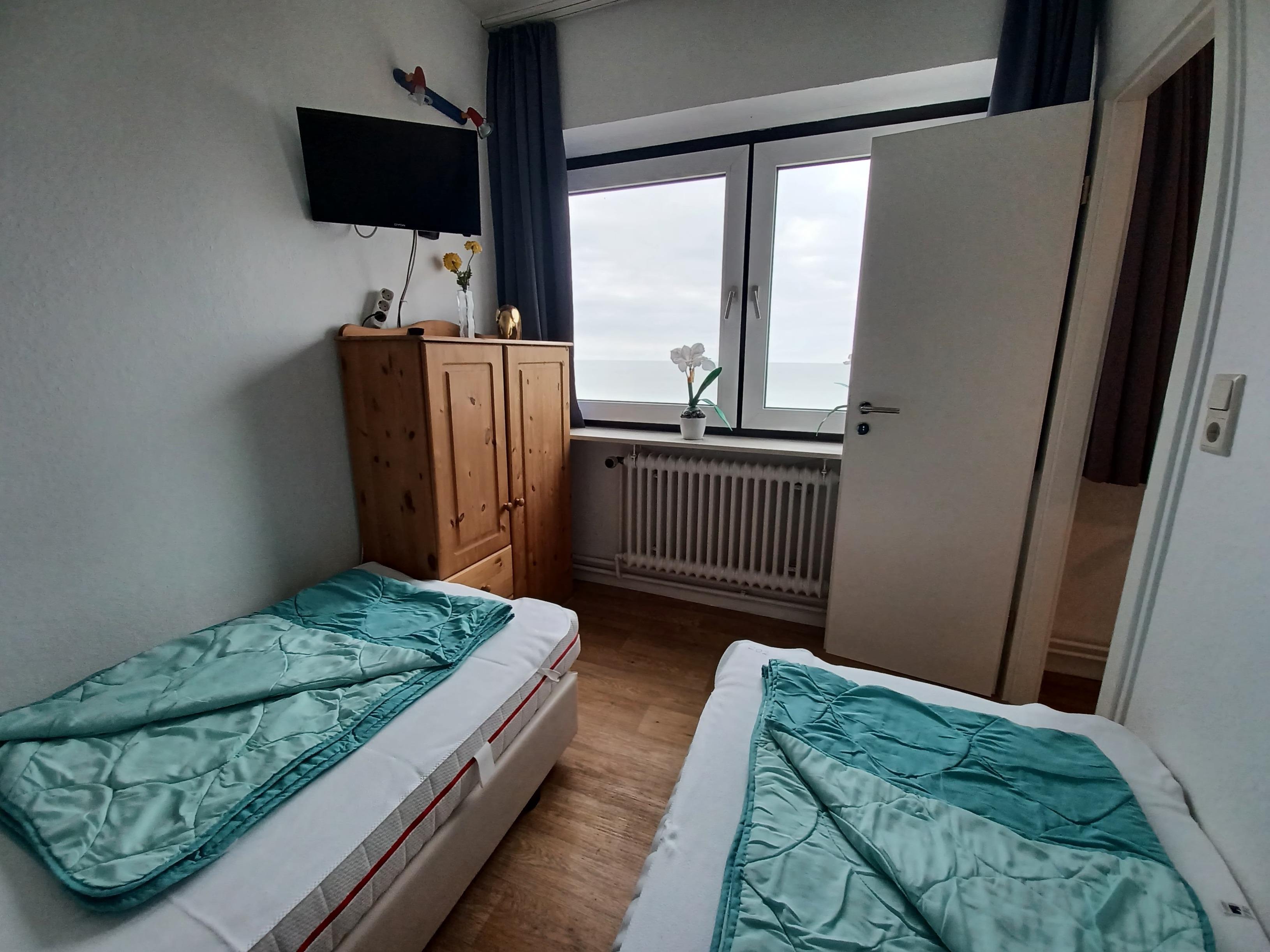 Erwachsene + 2 Kinder) gliedert sich auf ca. 41 qm in einen kombinierten Wohn-Schlafraum mit einem Essplatz am Fenster, Sitzgruppe, Doppelbett und dem tollen Blick aus jedem Fenster auf Strand und Meer. Das Kinderzimmer wartet mit 2 Einzelbetten und einem 2. TV auf seine kleinen Gäste.