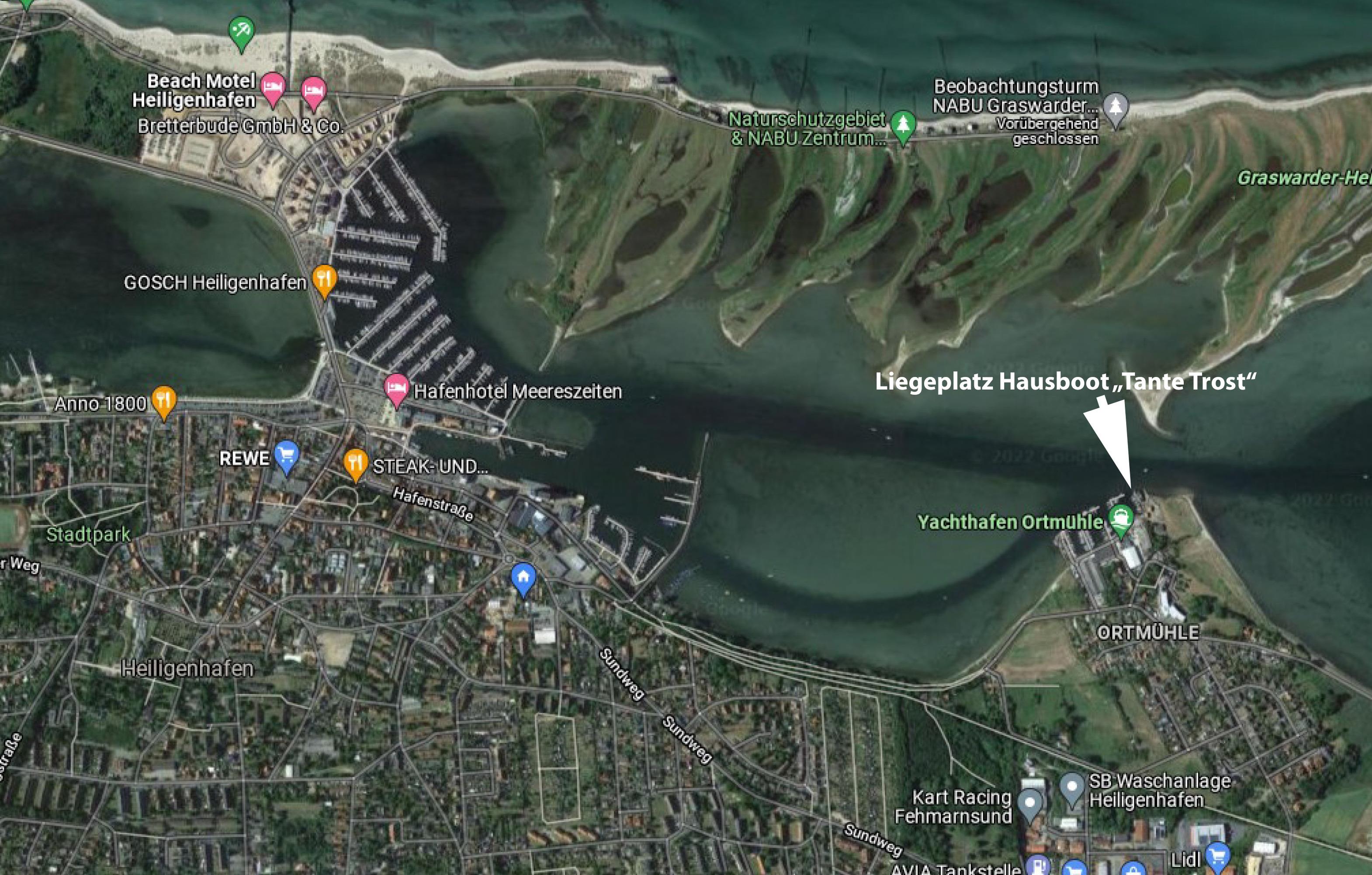 "Tante Trost" liegt am Außensteg des Werfthafens Boat and Living in Heiligenhafen Ortmühle. Im Werfthafen gibt so gut wie keinen Puplikumsverkehr, der Liegeplatz ist sehr ruhig. Du kannst vom Hausboot aus über eine Badeleiter schwimmen gehen oder Stand-Up Paddeln. Du kannst von der Sonnenterrasse angeln, dir ein kleines Sportboot in der Werft mieten oder einfach auf dem Sonnendeck einen Cocktail schlürfen, dein Früstück geniesen und dabei die ein- und ausfahrenden Yachten und Ausflugdampfer bewundern und mit einem Fernglas die Vogelwelt auf dem Grawarder oder den Vogelzug der Graugänse direkt über dem Hausboot beobachten. Der Strand für die "Eingeborenen" ist 200 m entfernt, der Heiligenhafener Strand an der Seebrücke fußläufig 2 km. In Heiligenhafen gibt es mehrere Fahradverleihfirmen. Die Umgebung, wie auch Fehmarn ist über ein gut ausgebautes Netz von Fahradwegen sehr gut zu erkunden.
