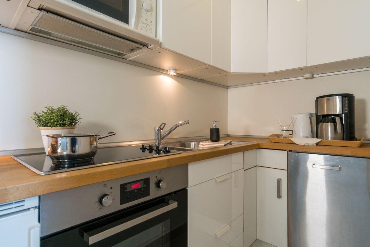 Das Schlafzimmer verfügt über ein gemütliches Doppelbett. Die kleine Küche ist, für den Urlaubsbedarf, voll ausgestattet. Eine Mikrowelle, ein Backofen und ein Geschirrspüler gehören ebenso dazu, wie die Kaffeemaschine, der Wasserkocher und ein Toaster. Geschirr und Besteck sind ausreichend vorhanden. Das Badezimmer ist mit einer Dusche mit Glastrennwand ausgestattet.