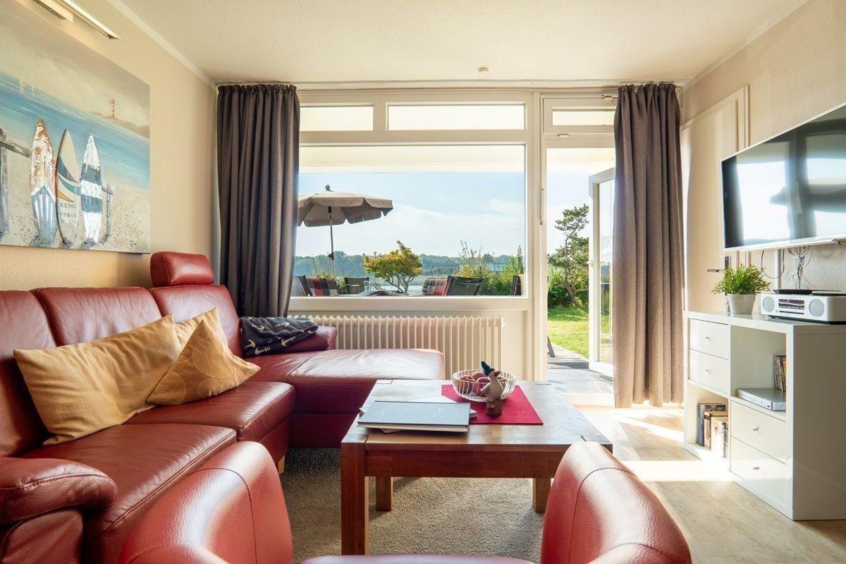 Die gemütliche, helle Erdgeschosswohnung liegt auf der Südseite des Hauses und verfügt über eine große Sonnenterrasse nur wenige Schritte vom Binnensee entfernt.