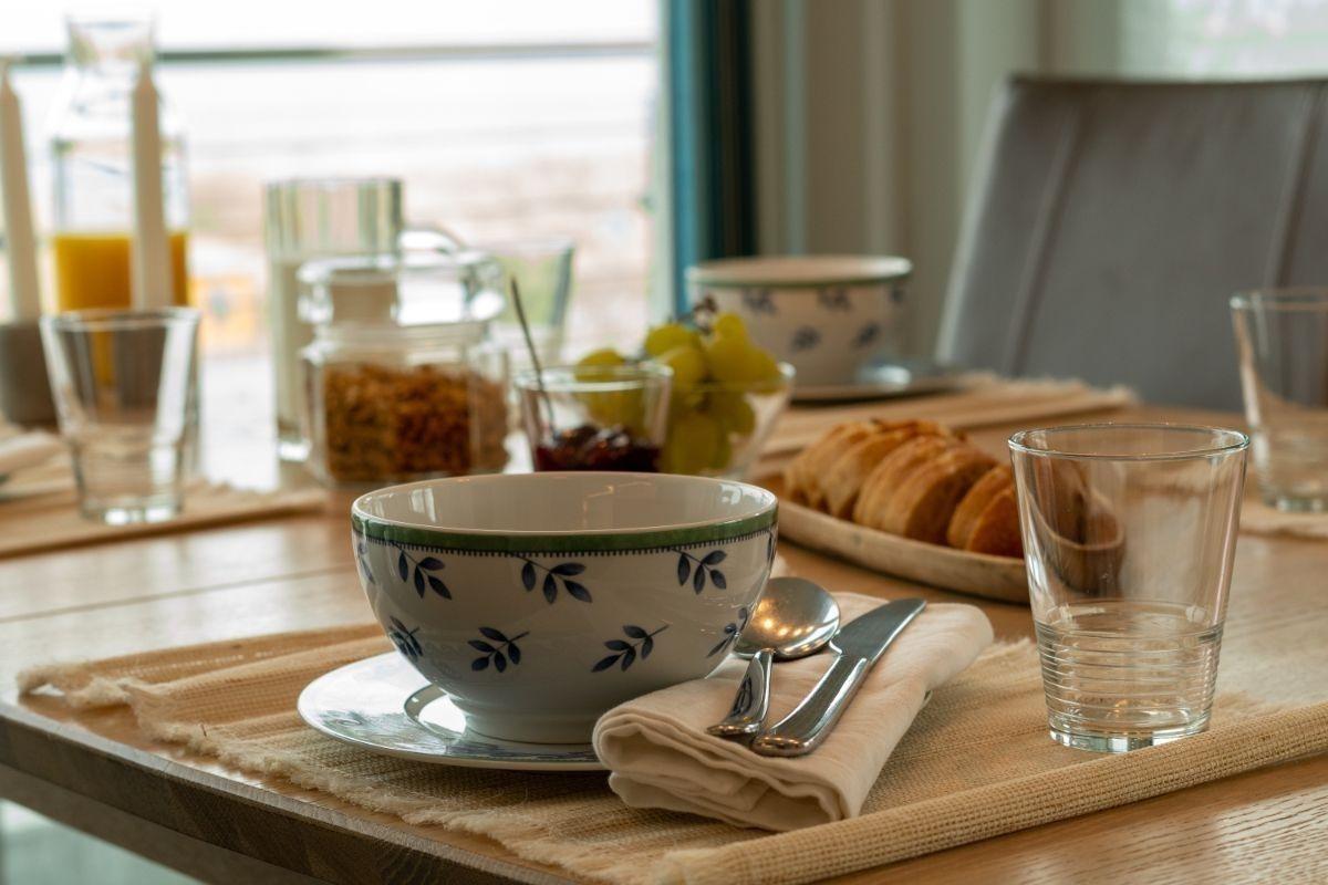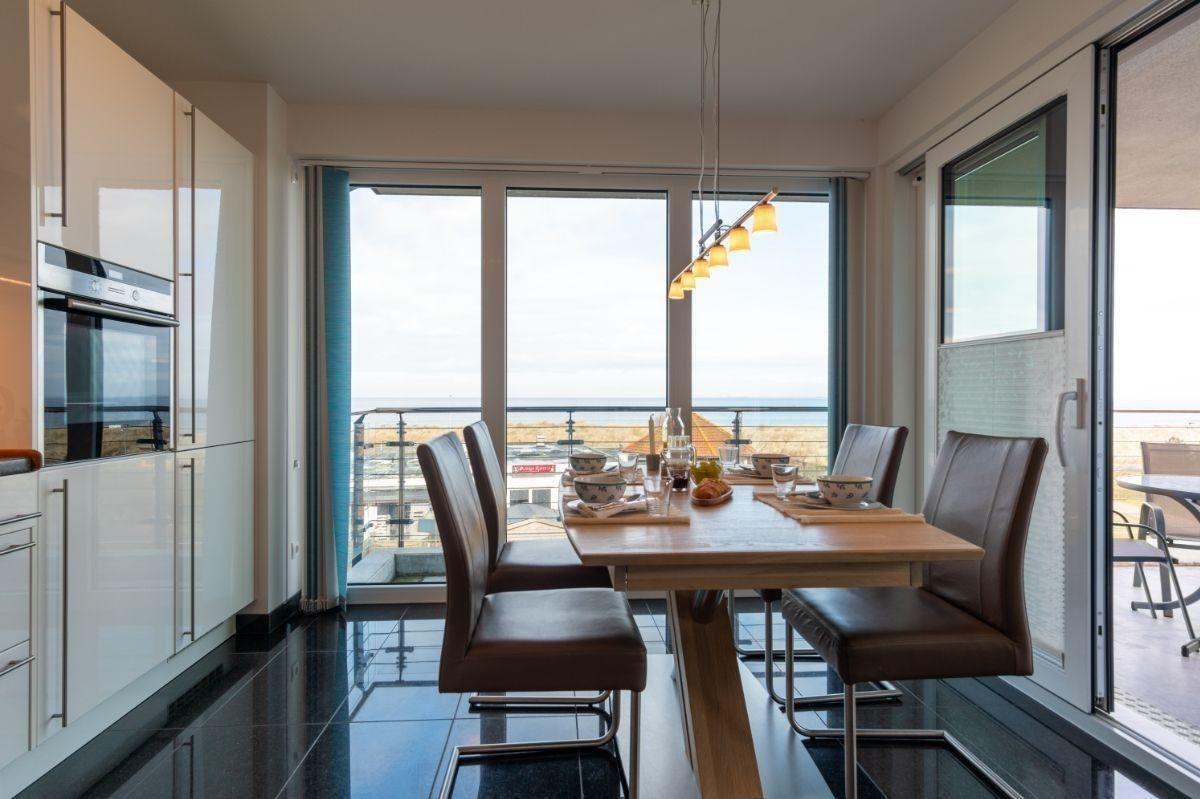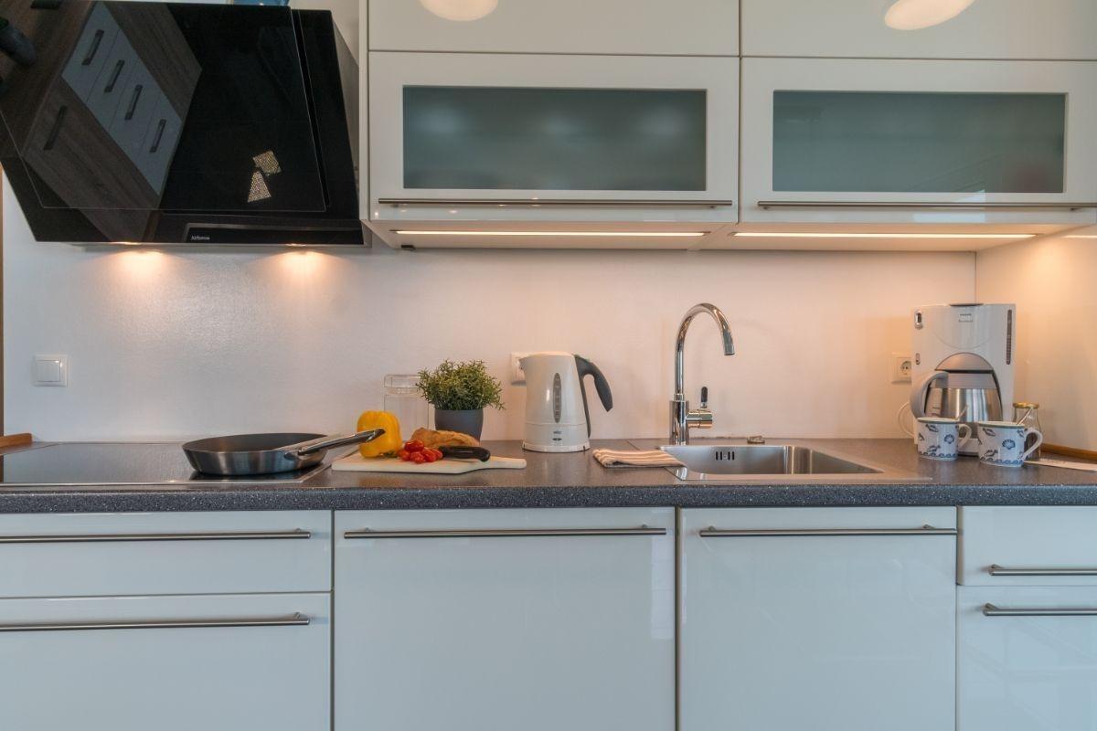 Urlauben Sie auf großzügigen 70m² (1. Etage) mit Nordost-Balkon. Das lichtdurchflutete Wohnzimmer ist mit einer gemütlichen Sofaecke und Flatscreen-TV ausgestattet. Im Essbereich finden bequem vier Personen Platz zum Schlemmen. Die angrenzende Küchenzeile ist, für den Urlaubsbedarf, voll ausgestattet. Ein Backofen und ein Geschirrspüler gehören ebenso dazu, wie die Kaffeemaschine, der Wasserkocher und ein Toaster. Geschirr und Besteck sind ausreichend vorhanden.