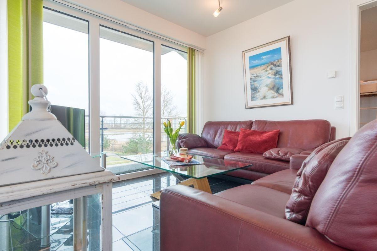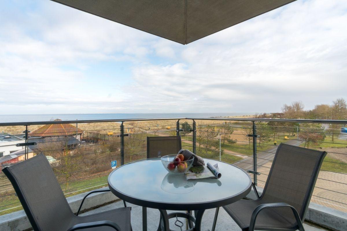 Vom Wohnzimmer aus gelangen Sie auf den Balkon mit Blick zur Ostsee.