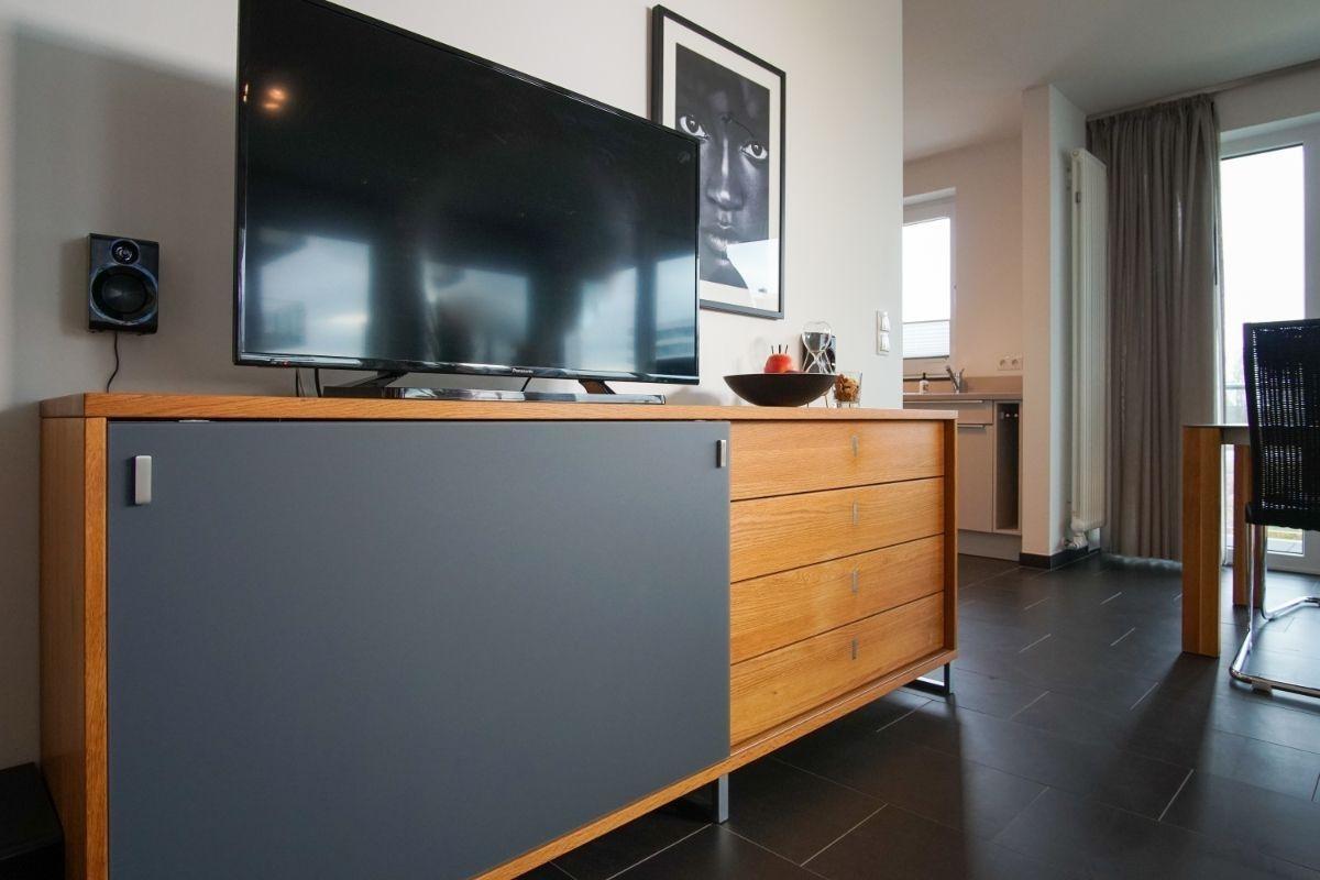Urlauben Sie auf großzügigen 59 m² (Erdgeschoss/Hochparterre) mit Südost-Balkon. Das lichtdurchflutete Wohnzimmer ist mit einer gemütlichen Sofaecke, TV und DVD-Player ausgestattet. Im Essbereich finden bequem zwei Personen Platz zum Schlemmen. Die angrenzende Küchenzeile ist, für den Urlaubsbedarf, voll ausgestattet. Ein Backofen und ein Geschirrspüler gehören ebenso dazu, wie die Kaffeemaschine, der Wasserkocher und ein Toaster. Geschirr und Besteck sind ausreichend vorhanden.