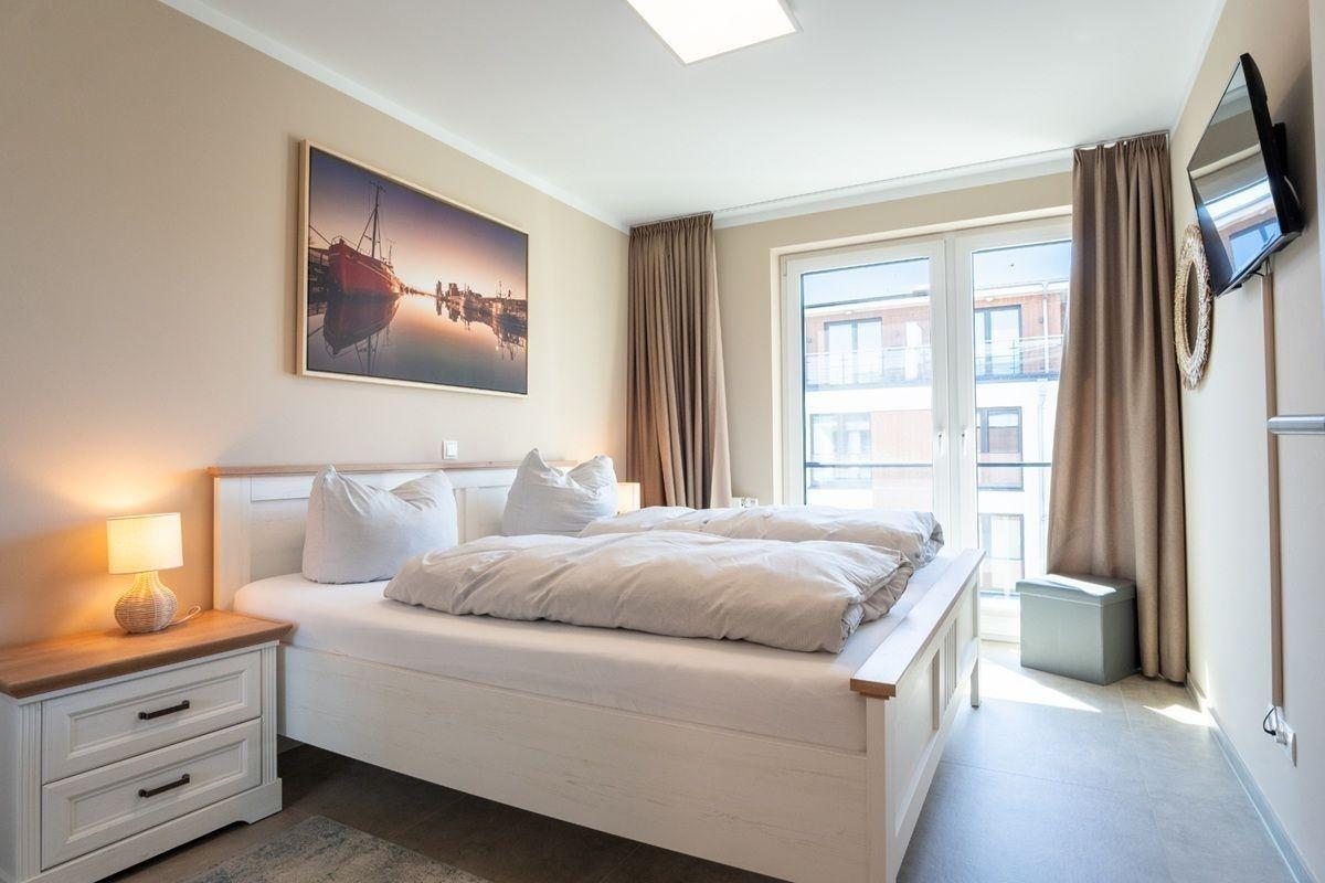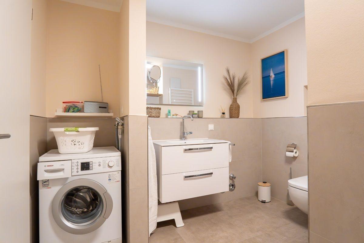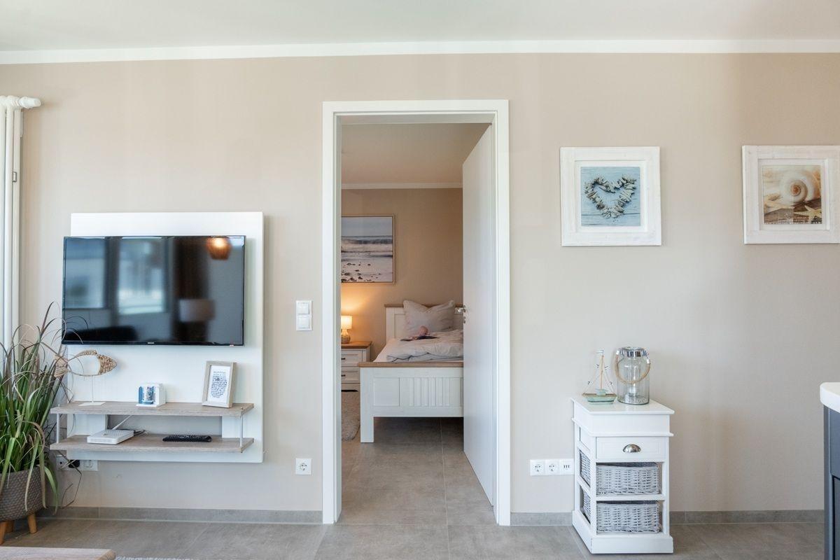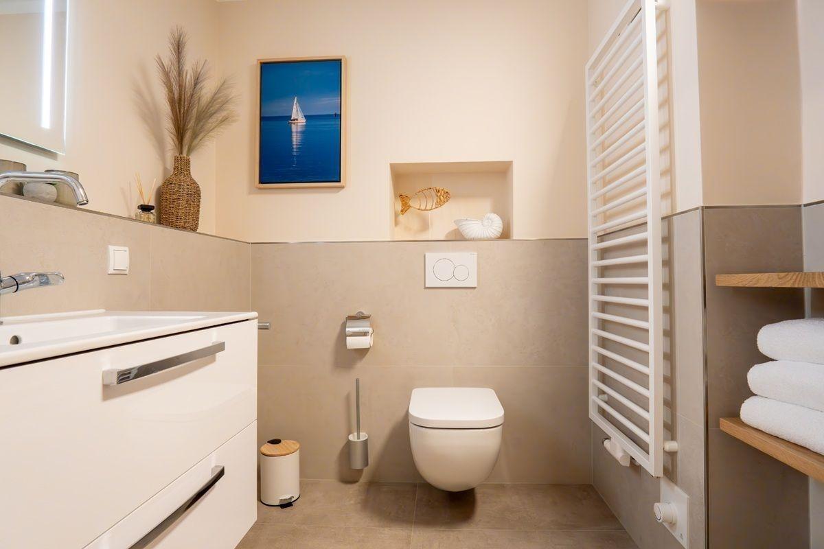 Das große Schlafzimmer verfügt über ein gemütliches Doppelbett (160*200cm). Das zweite Schlafzimmer ist mit zwei Einzelbetten, TV und einem geräumigen Schrank eingerichtet. Das Badezimmer ist mit einer ebenerdigen Dusche mit Glastrennwand und einem Handtuchheizkörper ausgestattet.