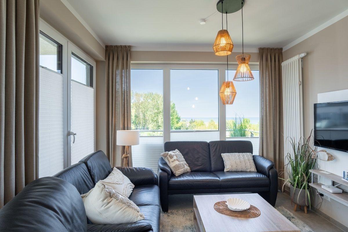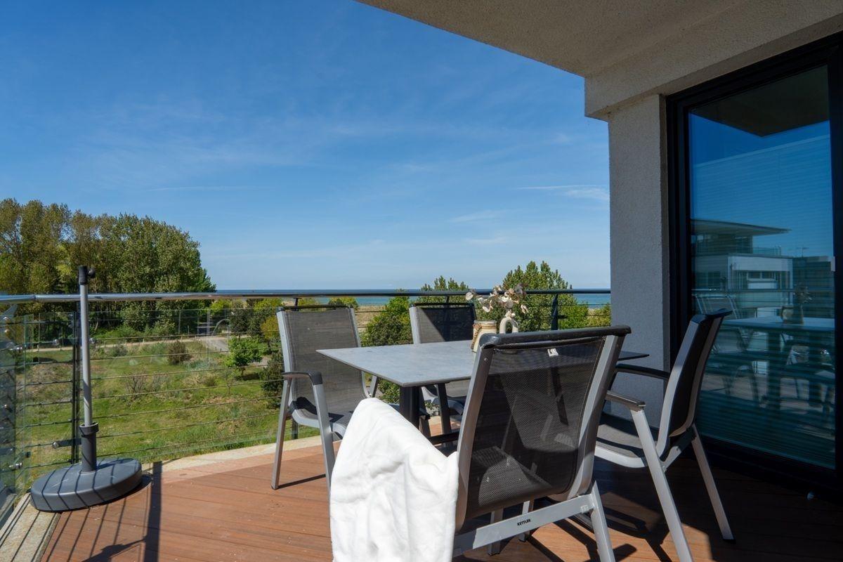 Vom Wohnzimmer aus gelangen Sie auf den Balkon mit Blick zur Ostsee.