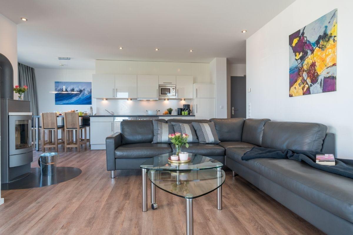 Moderne Penthousewohnung in Heiligenhafen mit Meerblick, Dachterrasse, Sauna und Kaminofen für erholsame Urlaubstage.