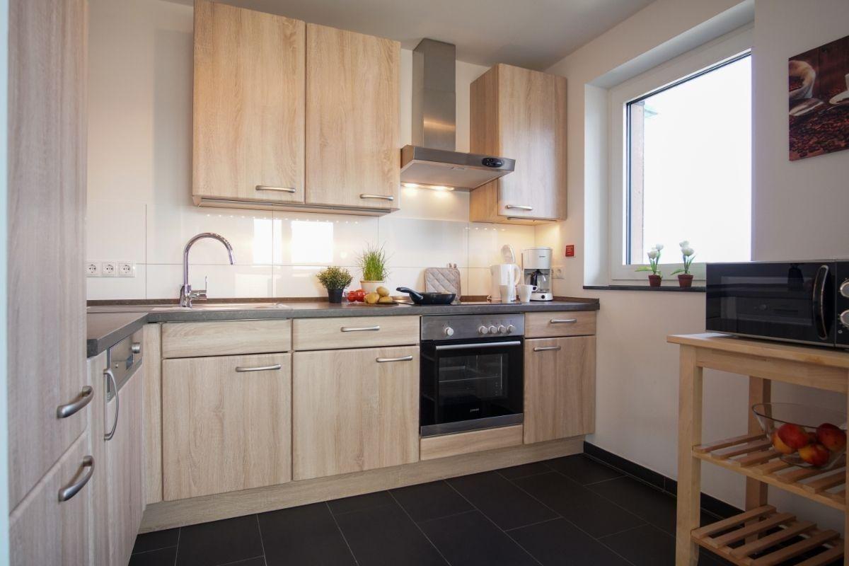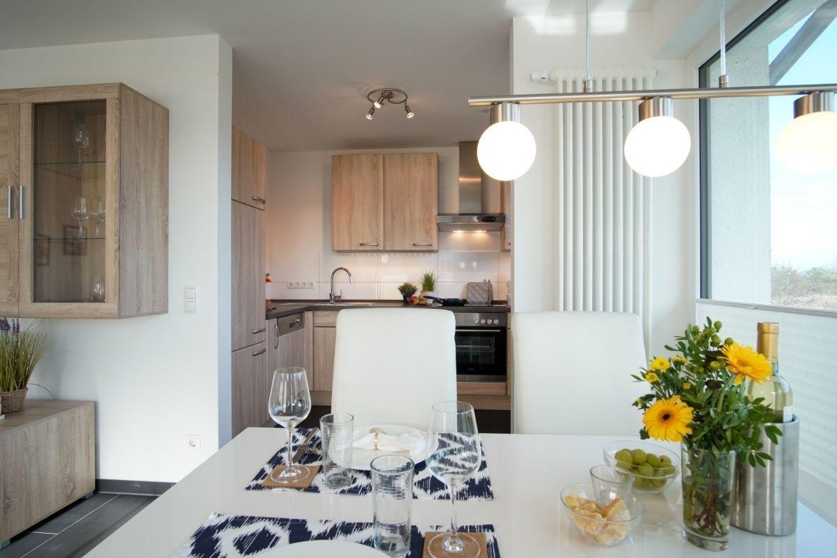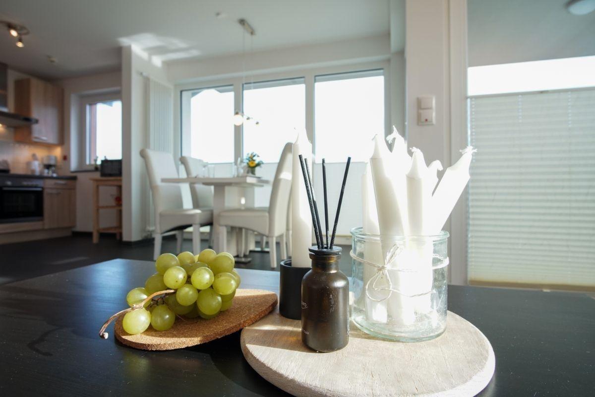 Urlauben Sie auf großzügigen 65 m² (Erdgeschoss/Hochparterre) mit Südost-Balkon. Das lichtdurchflutete Wohnzimmer ist mit einer gemütlichen Sofaecke, TV und Büchern ausgestattet. Im Essbereich finden bequem bis zu vier Personen Platz zum Schlemmen. Die angrenzende Küchenzeile ist, für den Urlaubsbedarf, voll ausgestattet. Ein Backofen und ein Geschirrspüler gehören ebenso dazu, wie die Kaffeemaschine, der Wasserkocher und ein Toaster. Geschirr und Besteck sind ausreichend vorhanden.