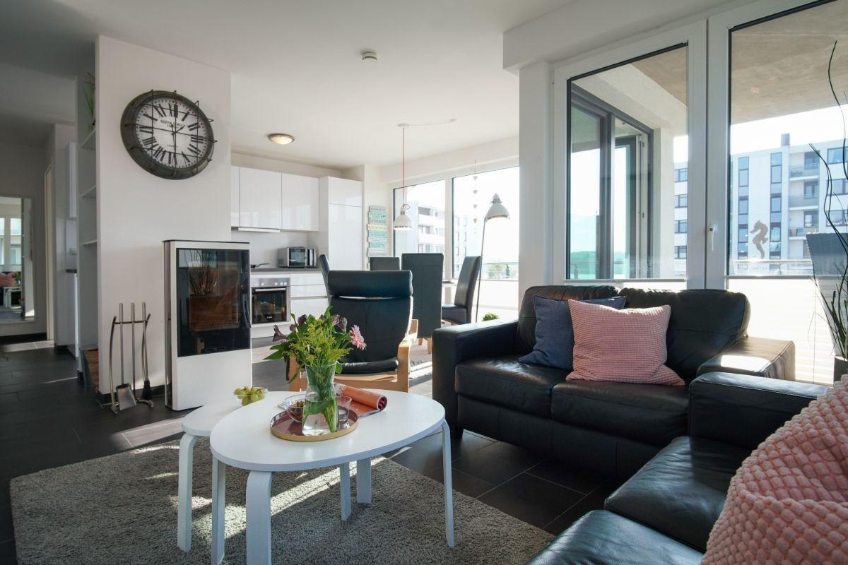 Genießen Sie Ihren Urlaub in der großzügigen Ferienwohnung im Haus "Sanddüne" auf dem Steinwarder in Heiligenhafen. Die Wohnung besticht nicht nur durch die unmittelbare Nähe zur Strandpromenade und zum Badestrand, sondern auch die ihre hochwertige Ausstattung. Im Wohnzimmer erwartet Sie eine gemütliche Sitzgruppe, die vor dem Kaminofen zum entspannen und verweilen einlädt. Die Ausstattung der offenen Küche erfolgte selbstverständlich mit allen Annehmlichkeiten wie Cerankochfeld, Backofen, Geschirrspüler, etc.
