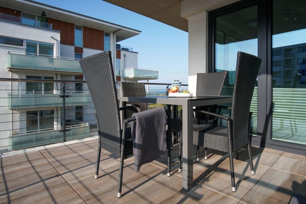 Aus dem Wohn- und Esszimmer gelangen Sie auf den 18qm großen Eck-Balkon in Süd-Westausrichtung, auf dem Sie die Sonne und den Blick aufs Meer genießen können, falls es Ihnen am Strand doch einmal zu voll wird.