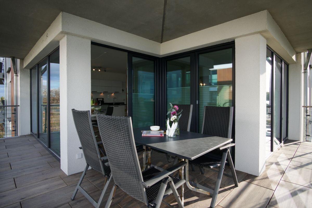 Vom Wohnzimmer aus gelangen Sie auf den Balkon mit Blick zur Ostsee.