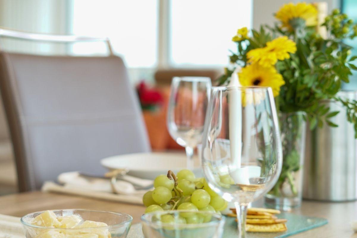 Urlauben Sie auf großzügigen 63 m² (2. Etage) mit Südost-Balkon. Das lichtdurchflutete Wohnzimmer ist mit einer gemütlichen Sofaecke, Flatscreen-TV und DVD-Player ausgestattet. Im Essbereich finden bequem vier Personen Platz zum Schlemmen. Die angrenzende Küchenzeile ist, für den Urlaubsbedarf, voll ausgestattet. Ein Backofen und ein Geschirrspüler gehören ebenso dazu, wie die Kaffeemaschine, der Wasserkocher und ein Toaster. Geschirr und Besteck sind ausreichend vorhanden.