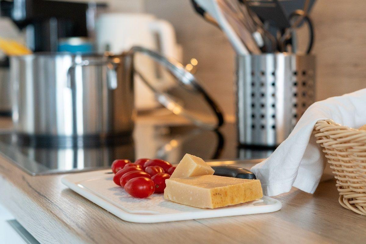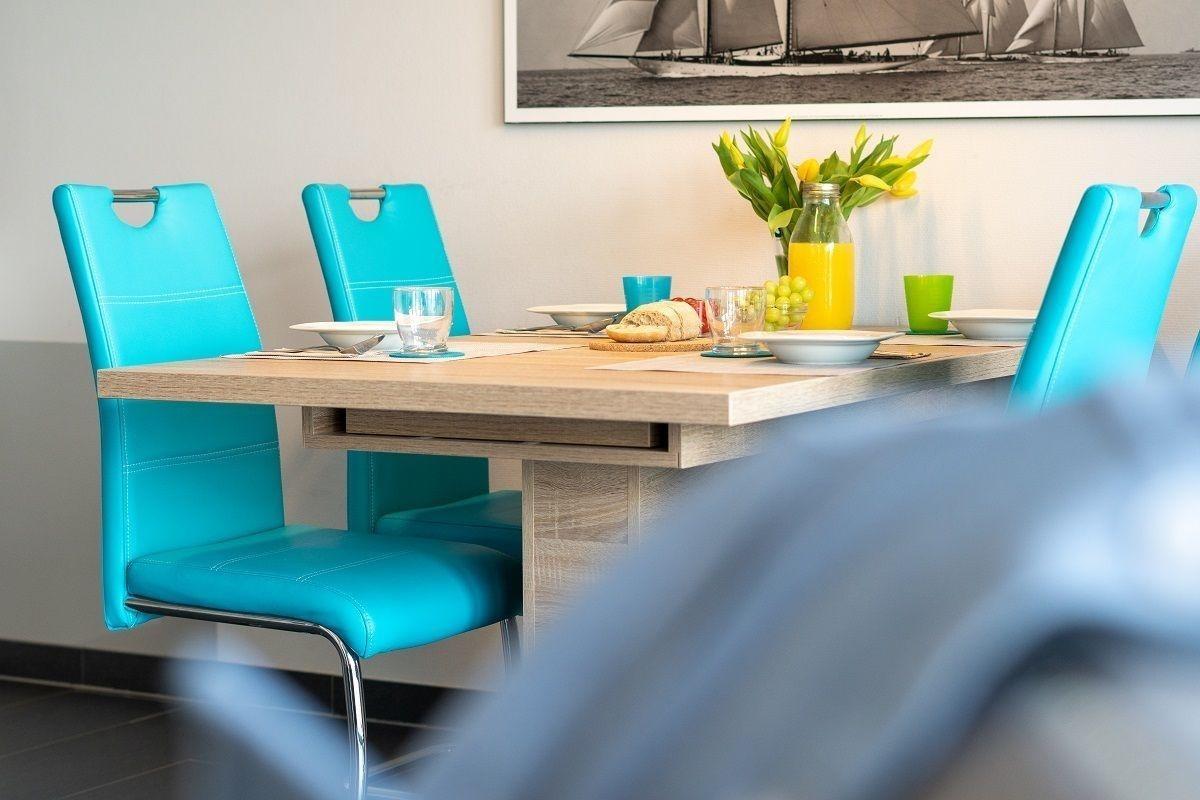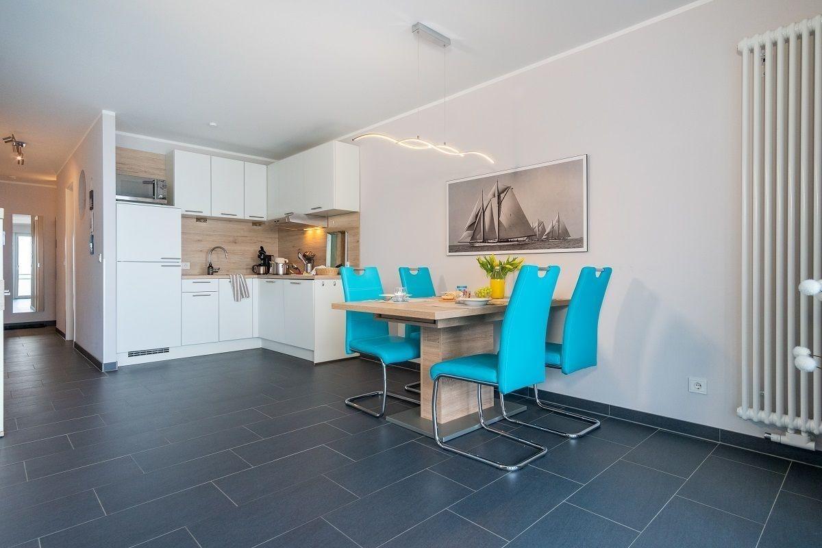 Urlauben Sie auf großzügigen 68 m² (1.Etage) mit Nordost-Balkon. Das lichtdurchflutete Wohnzimmer ist mit einer gemütlichen Sofaecke und Flatscreen-TV ausgestattet. Im Essbereich finden bequem vier Personen Platz zum Schlemmen. Die angrenzende Küchenzeile ist, für den Urlaubsbedarf, voll ausgestattet. Ein Backofen und ein Geschirrspüler gehören ebenso dazu, wie die Kaffeemaschine, der Wasserkocher und ein Toaster. Geschirr und Besteck sind ausreichend vorhanden.