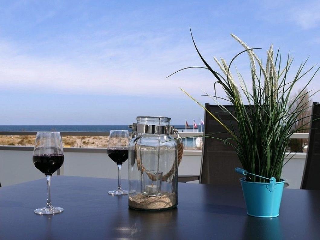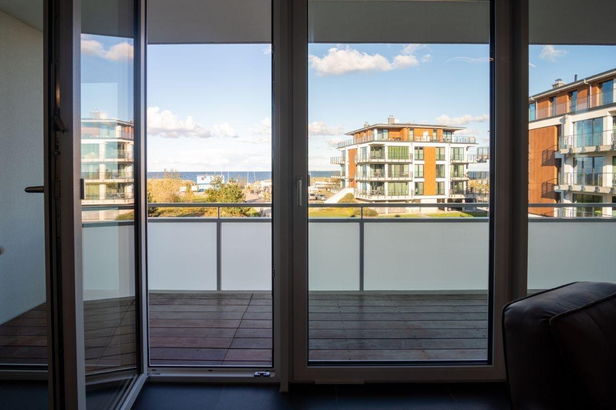 Vom Wohnzimmer aus gelangen Sie auf den Balkon mit Blick zur Ostsee.