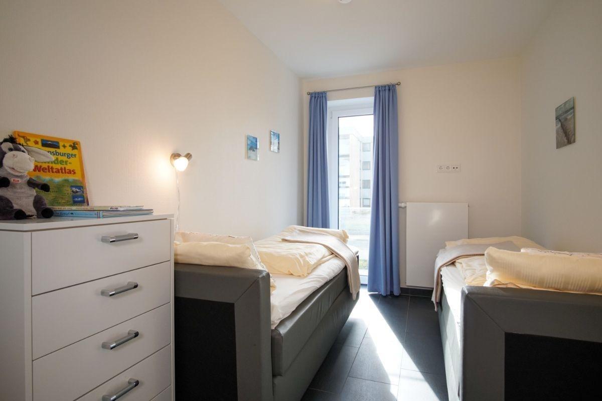 Das große Schlafzimmer verfügt über ein gemütliches Doppelbett (160*200cm). Das zweite Schlafzimmer ist mit zwei Einzelbetten und einem geräumigen Schrank eingerichtet. Das Badezimmer ist mit einer ebenerdigen Dusche mit Glastrennwand und einer Waschmaschine ausgestattet.