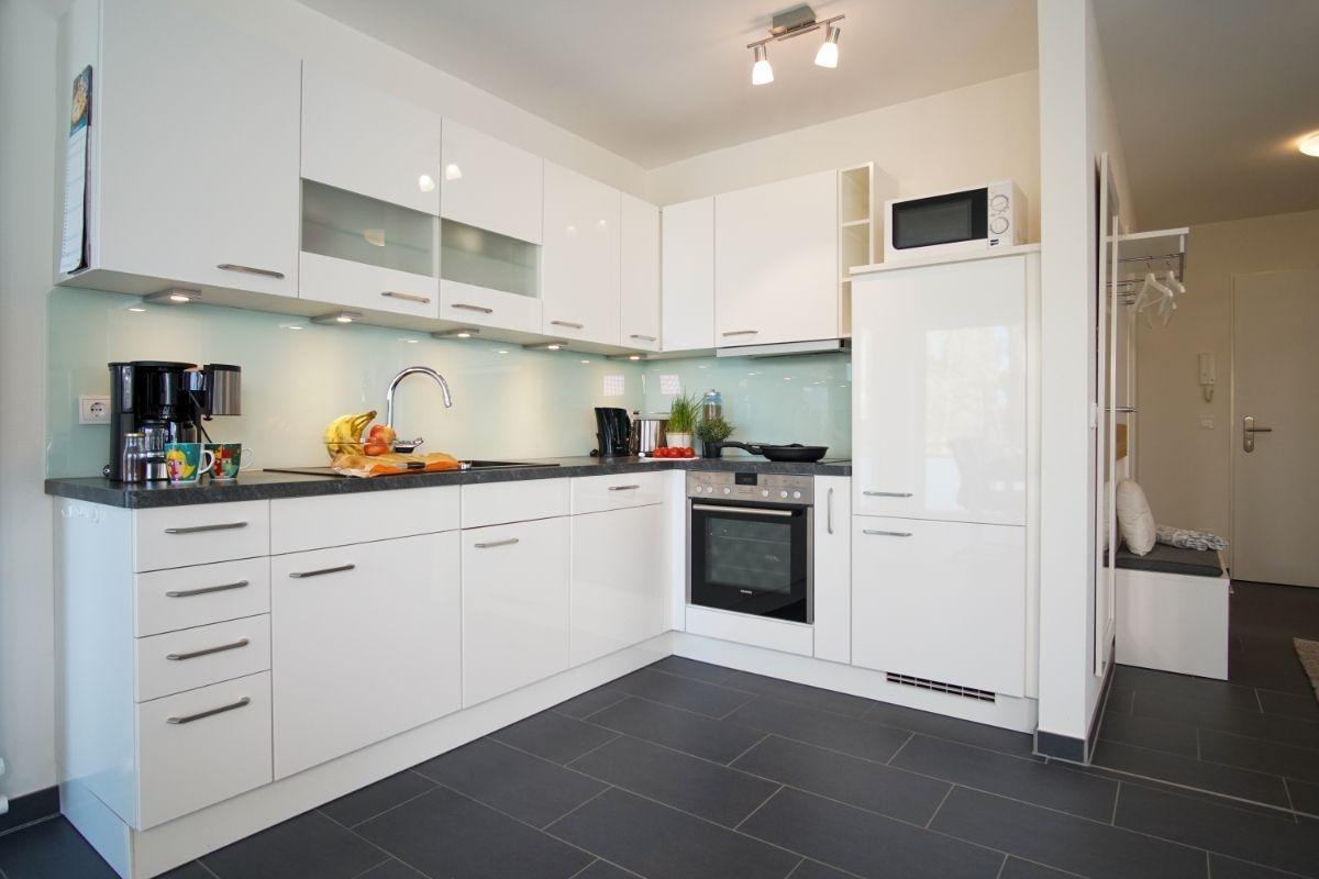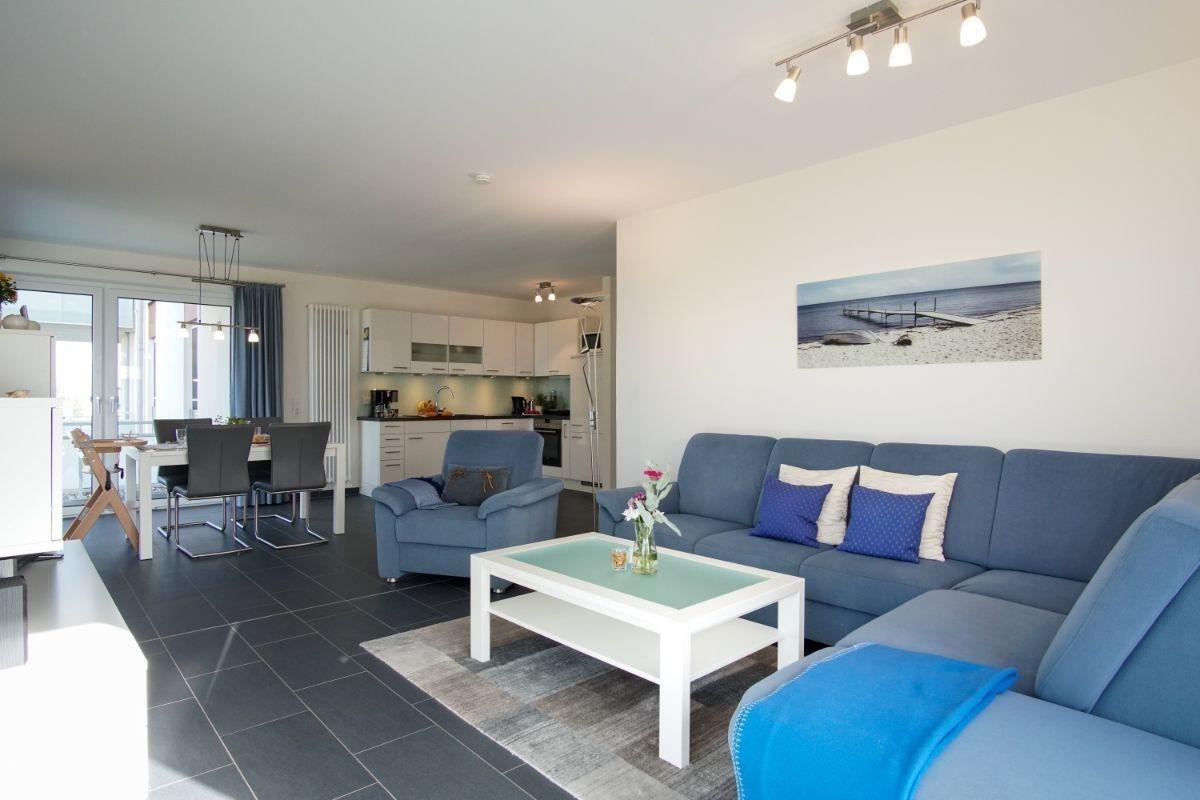 Urlauben Sie auf großzügigen 76 m² (Erdgeschoss/Hochparterre) mit Nordwest-Balkon. Das lichtdurchflutete Wohnzimmer ist mit einer gemütlichen Sofaecke und Flatscreen-TV ausgestattet. Im Essbereich finden bequem vier Personen Platz zum Schlemmen. Die angrenzende Küchenzeile ist, für den Urlaubsbedarf, voll ausgestattet. Ein Backofen und ein Geschirrspüler gehören ebenso dazu, wie die Kaffeemaschine, der Wasserkocher und ein Toaster. Geschirr und Besteck sind ausreichend vorhanden.