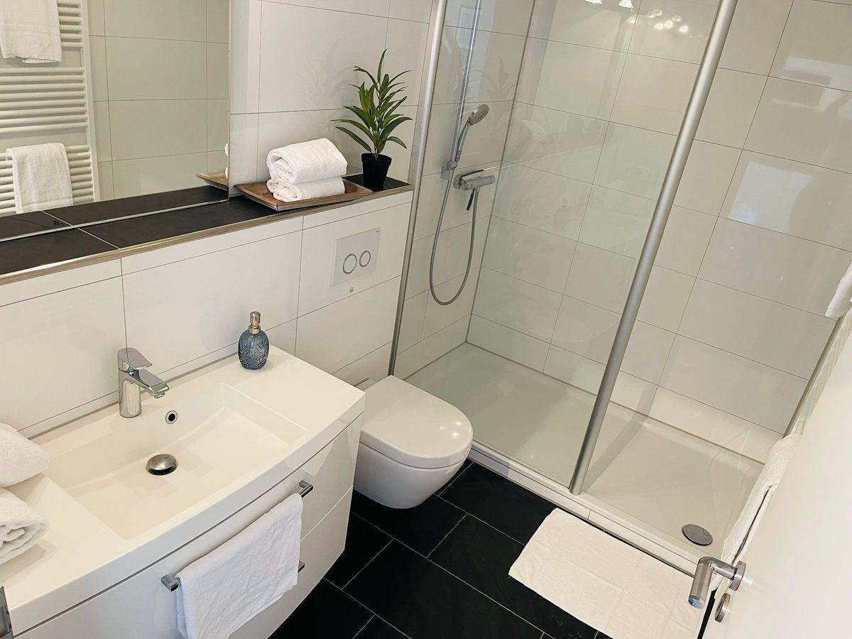 Der Schlafbereich ist mit einem komfortablen Doppelbett (Boxspringbett (160*200cm) eingerichtet. Das Badezimmer wurde ebenfalls modernisiert und verfügt über eine Dusche mit Glastrennwand.