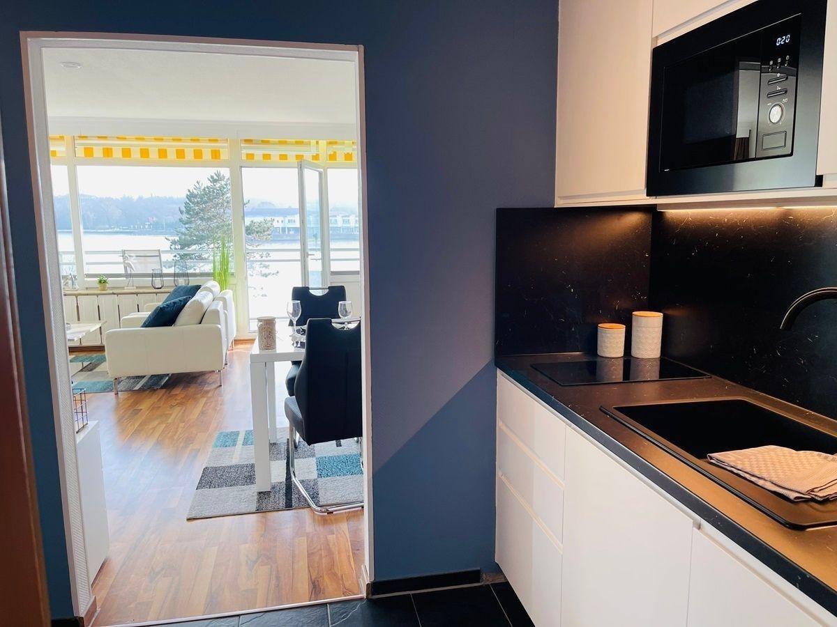 Vom Wohnzimmer aus gelangen Sie auf den Balkon mit Seeblick (Binnensee).